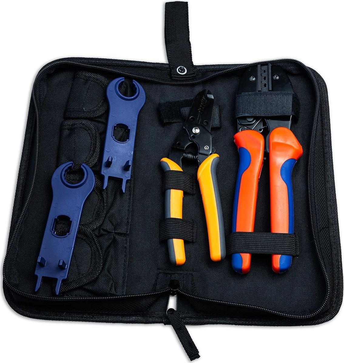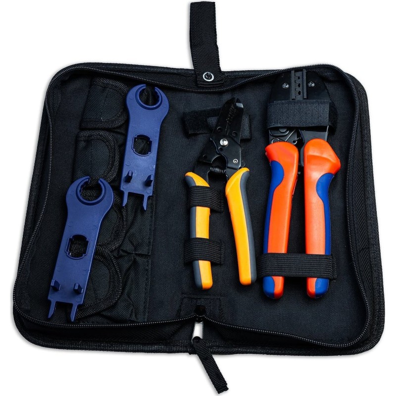 Ein hochwertiges Werkzeugset, das mit MC4-Steckverbindern und den gängigsten in der Photovoltaik verwendeten Kabeln kompatibel ist.
