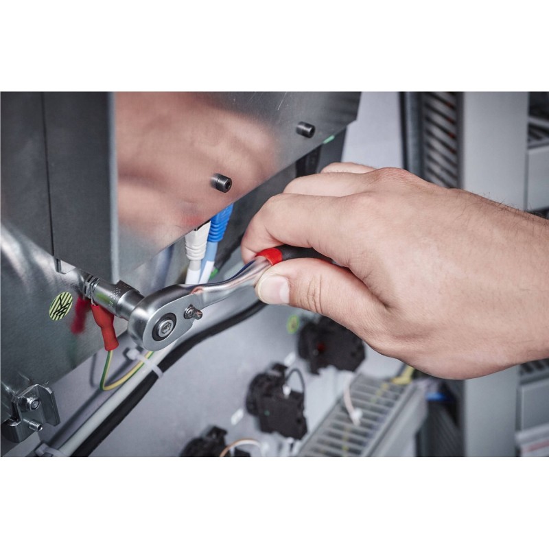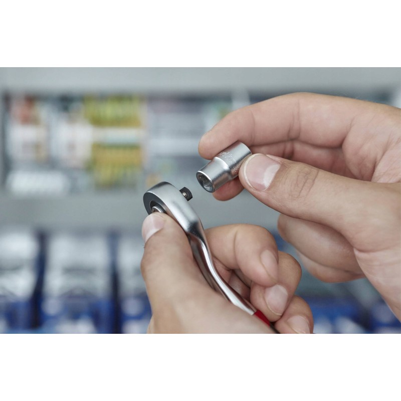Die Ratsche ermöglicht auch das Arbeiten in engen Räumen, und ihre gebogene Form sorgt für bessere Kontrolle und Schutz vor Verletzungen. Erfüllt die Normen DIN 3122 / ISO 331.