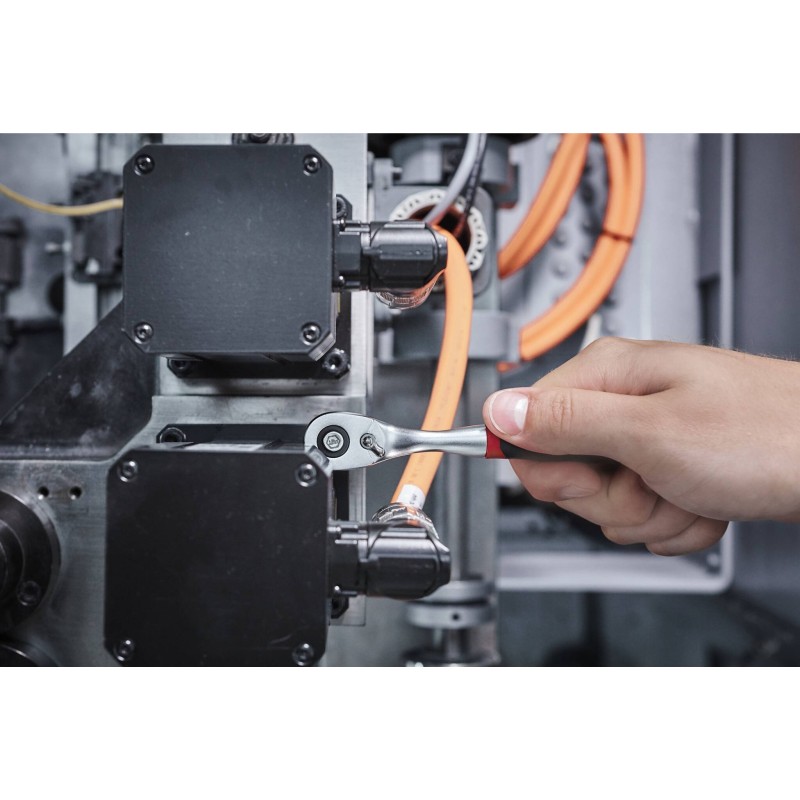 Die gebogene Form sorgt für eine erhöhte Griffposition, wodurch mehr Kraft aufgewendet werden kann und die Finger vor Verletzungen geschützt werden. Die präzise verzahnte Ratsche mit 72 Zähnen und einem geringen Rücklaufwinkel von 5° ermöglicht zudem das Arbeiten an engen Stellen. Mit Hilfe des Umschalthebels lässt sich die Drehrichtung nach rechts oder links leicht umstellen. Die robuste Umschalt-Ratsche ermöglicht sicheres Arbeiten und hält Belastungen stand, die weit über die Anforderungen der DIN-Normen hinausgehen, bis zu einem Anzugsmoment von 93 Nm.
