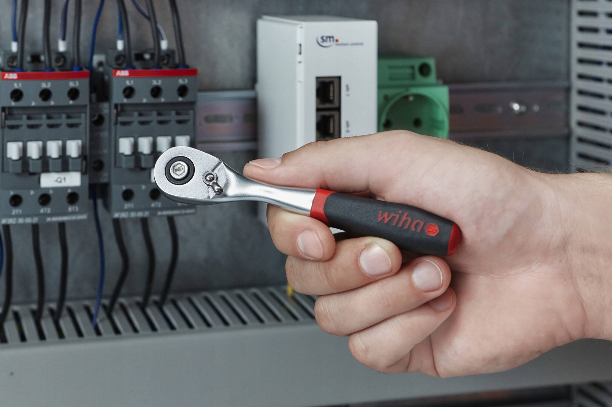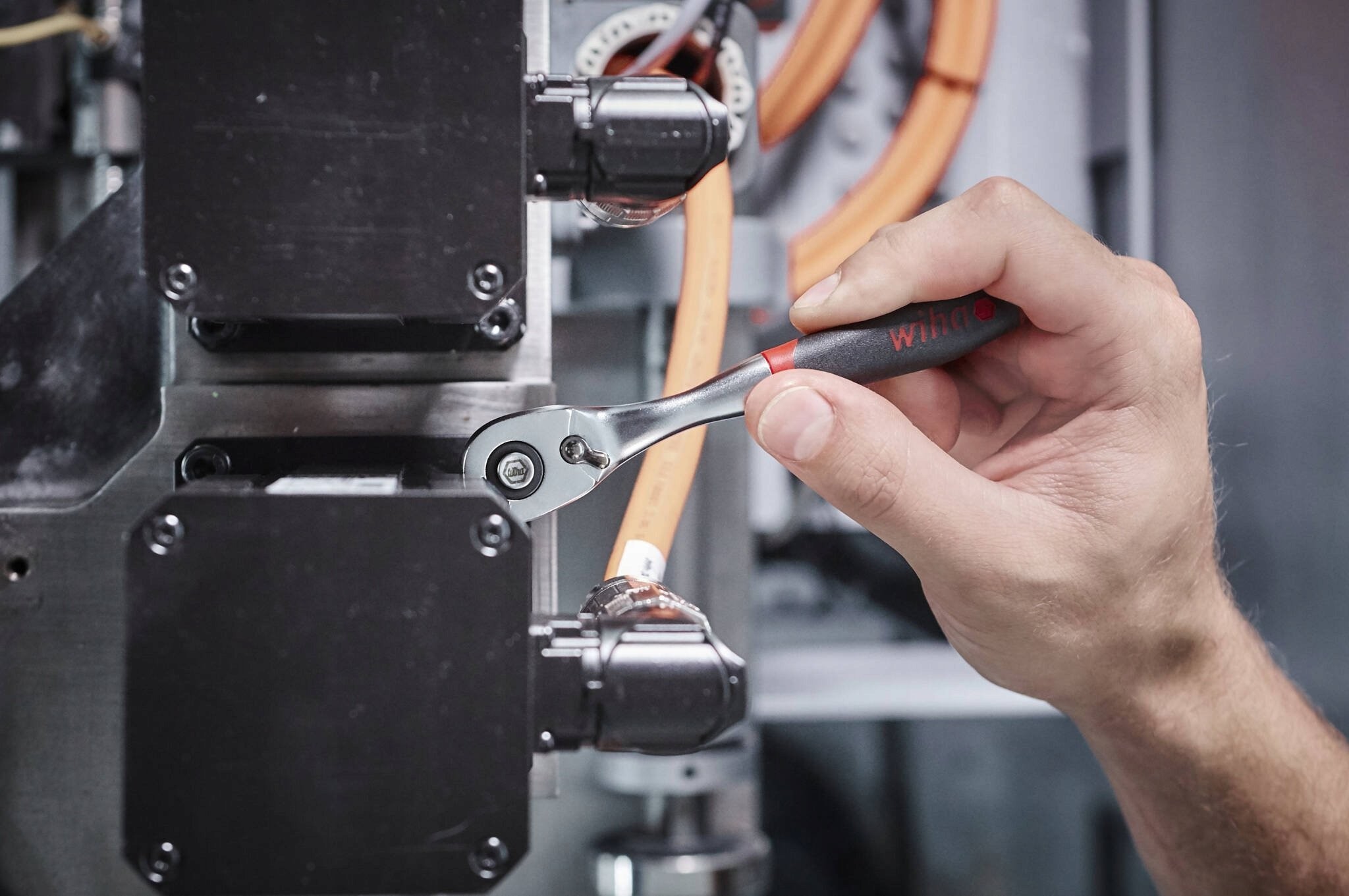 Sicherer Halt und einfacher Austausch der Steckschlüsseleinsätze dank der per Knopfdruck lösbaren Kugelverriegelung. Das Anziehen sowie das Lösen festsitzender Schrauben und Sechskantmuttern erfordert den Einsatz großer Kraft. Die umschaltbare Ratsche von Wiha ermöglicht das einfache Öffnen und Schließen jeder Schraubverbindung.