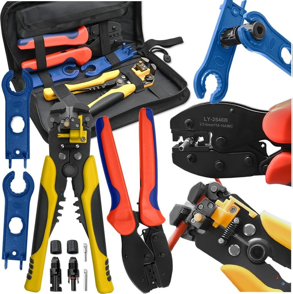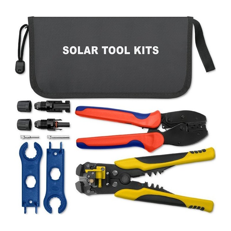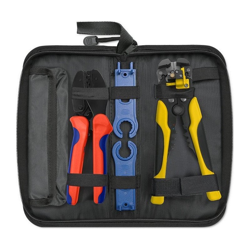 Die praktische Aufbewahrungstasche für Solarwerkzeuge erleichtert Ihnen den Transport der Werkzeuge während der Montage der Solaranlage und schützt sie vor versehentlichem Verlust und mechanischen Beschädigungen. Alle Werkzeuge sind mit MC4-Steckverbindern kompatibel, sodass Sie alle Arbeiten im Zusammenhang mit der Montage von Solarsteckverbindern und dem Anschluss von Kabeln an die Photovoltaikanlage ausführen können. Schon jetzt können Sie mühelos die Isolierung von Kabeln abisolieren oder Kabel und Leitungen mit unterschiedlichen Durchmessern durchtrennen.