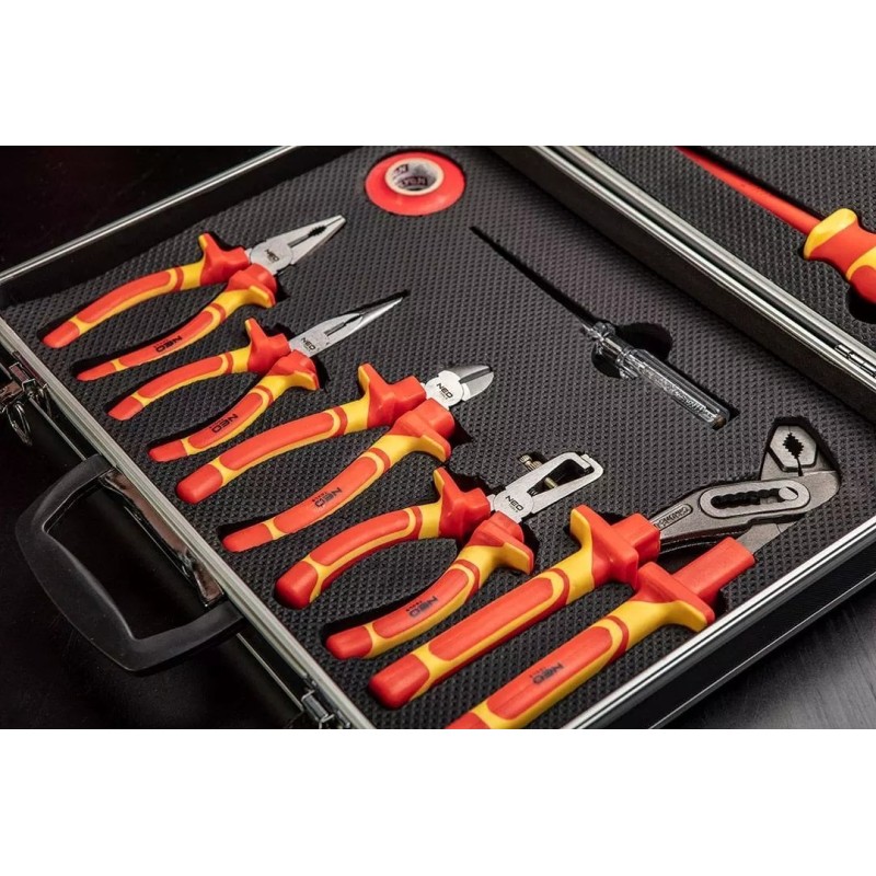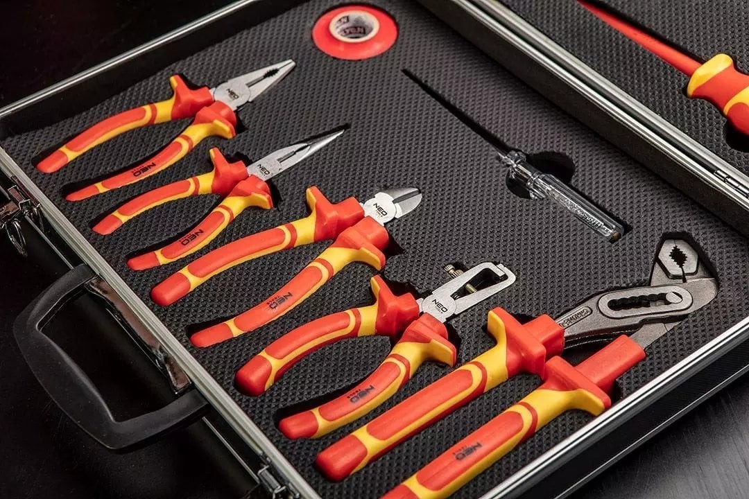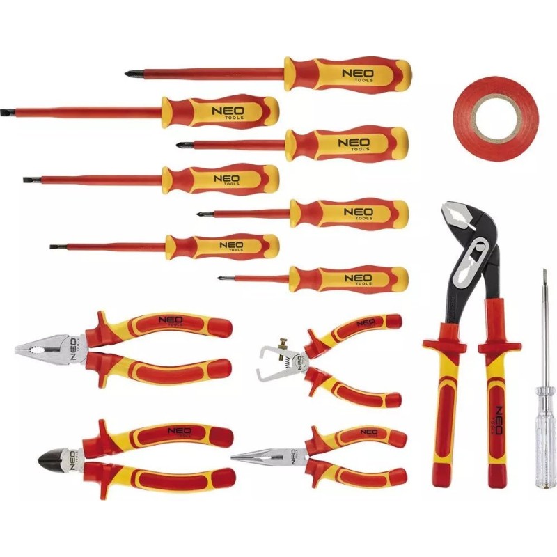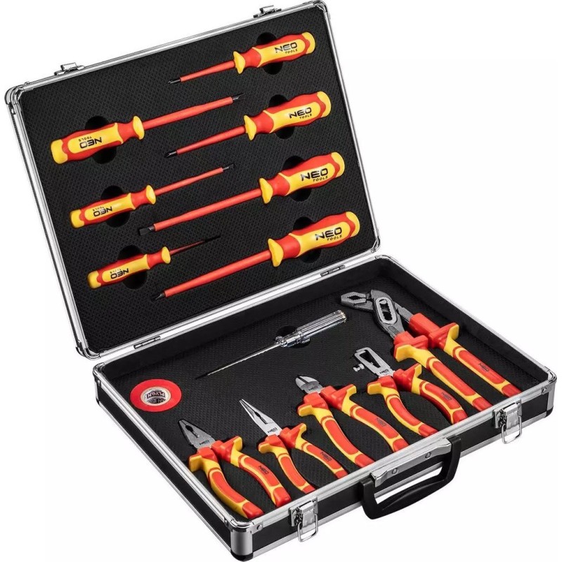 Das 1000-V-Werkzeugset NEO (Art.-Nr. 01-234) enthält 13 Teile, darunter Schraubendreher und Zangen. Zugelassen für Arbeiten unter Spannung bis 1000 V. Die Schraubendreherklingen bestehen aus besonders widerstandsfähigem Chrom-Molybdän-Stahl. Die Backen der Zangen sind aus Chrom-Vanadium-Stahl geschmiedet. Zweikomponenten-Ergogriffe erhöhen den Arbeitskomfort. Die Zuverlässigkeit des Produkts wird durch eine 25-jährige Garantie bestätigt. Die Marke NEO erfüllt die Erwartungen von Profis.