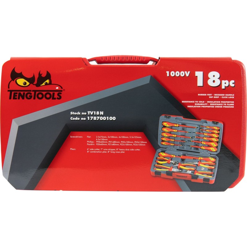 Set bestehend aus 18 Teilen. Enthält 13 Schraubendreher und 5 Zangen, hergestellt gemäß der Norm IEC 60900, für Arbeiten unter Spannung bis 1000 V (durch speziell geschultes Personal). Lieferung in einer Kunststoffbox mit Metallverschluss, klappbarem Griff und Scharnier mit Metallachse. An der Unterseite der Box befinden sich rutschfeste Gummifüße.