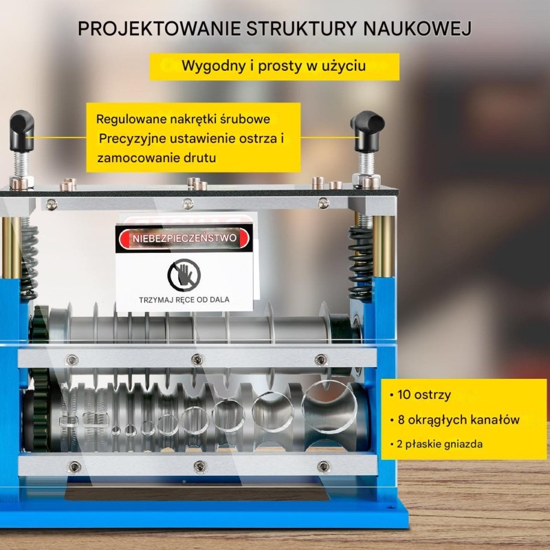 Die Maschine wurde für maximale Effizienz entwickelt. Dank 11 Kanälen und 10 Klingen ermöglicht sie die gleichzeitige Bearbeitung verschiedener Kabeltypen, was die Arbeitsleistung deutlich steigert. Sie verarbeitet Kabel mit einem Durchmesser von 1,5 mm bis 38 mm und ist damit ein vielseitiges Werkzeug für jede Situation.