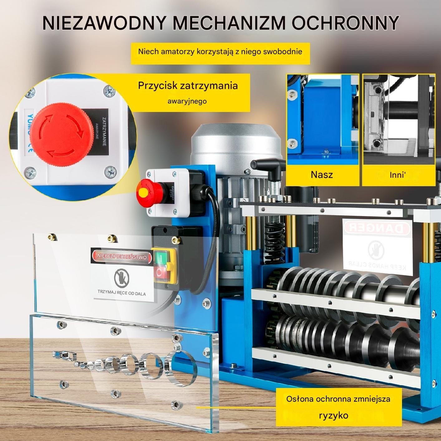 Die Sicherheit des Benutzers hat für uns oberste Priorität. Die Maschine ist mit einer Schutzhaube und einem Not-Aus-Schalter ausgestattet, was das Unfallrisiko minimiert. Zusätzliche Sicherheitsfunktionen schützen vor dem versehentlichen Hineingreifen mit der Hand in die Maschine.