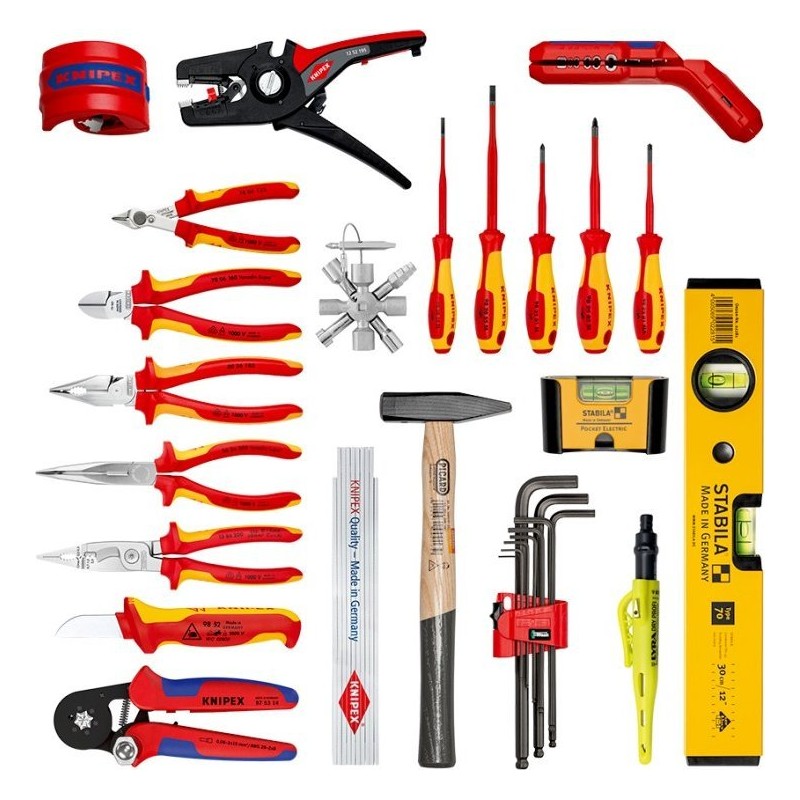 Ausgestattet mit 16 KNIPEX-Werkzeugen, insgesamt 22 Markenwerkzeuge, teilweise VDE-geprüft nach DIN EN 60900