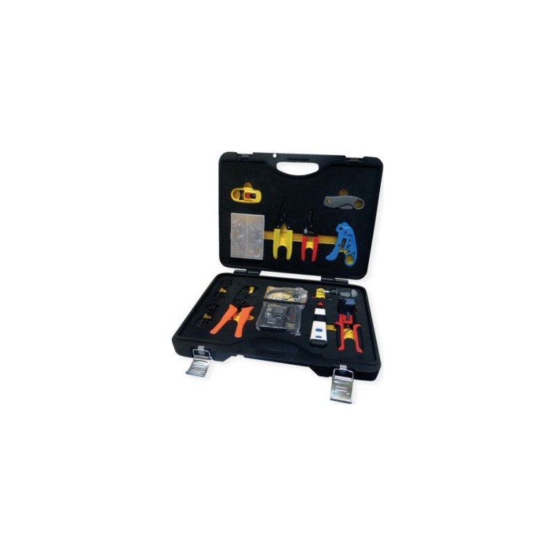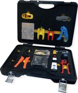 Werkzeugsatz mit allen Werkzeugen, die zum Crimpen und Prüfen gängiger Kabel benötigt werden. Enthält eine Crimpzange für Koaxialkabel mit passenden Guss-Einsätzen, eine Crimpzange für doppelte Modularstecker, Kabelscheren, Präzisions- und Universalklingen sowie Verformungswerkzeuge, Schlag- und Verlegewerkzeuge (für Typ 110), einen Abisolierer für Koaxialkabel, einen Netzwerkkabeltester, einen Kreuzschlitzschraubendreher und einen robusten Koffer mit Schaumstoffauskleidung. - HT-336A4 Koaxial-Crimpzange - HT-3C Guss-Einsätze Sechskant .256" .319" .068" .213" - HT-3G Guss-Einsätze Sechskant .043" .068" .100" .137" .213" .255" - HT-3J Guss-Einsätze Sechskant .042" .068" .078" .128" .151" .178" - HT-3K Guss-Einsätze Sechskant .100" .128" .429" - HT-568R Werkzeug zum Crimpen von doppelten Modularsteckern - HT-206 Kabelschneider - HT-5021 Präzisionsmesser und -schneider - HT-S501A Universalmesser und Trennwerkzeug - HT-314B Schlag- und Befestigungswerkzeug (für Typ 110) - HT-14 für Typ 66 - HT-332 Abisolierwerkzeug für Koaxialkabel (2 Klingen) - HT-322 Abisolierwerkzeug für Koaxialkabel (3 Klingen) - 251452 Hobbes-Netzwerkkabeltester - Kreuzschlitzschraubendreher - Hartschalenkoffer mit Schaumstoffeinlage (375 x 253 x 60 mm)