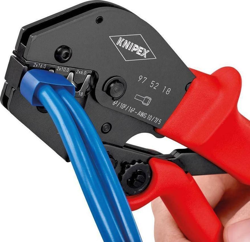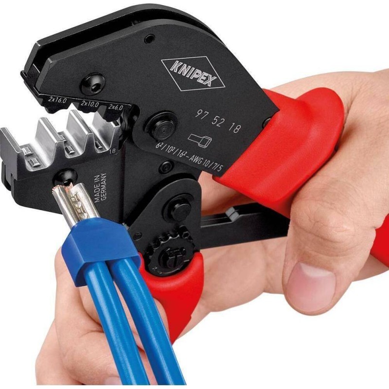 Zange zum Crimpen von Kabelmuffen vom Typ Twin Ausführung: aus hochwertigem Chrom-Vanadium-Elektrostahl, geschmiedet, ölgehärtet und angelassen. Kopf geschwärzt. Für optimale Crimp-Ergebnisse dank präziser Profile und einer zwangsgeführten, lösbaren Arretierung ist die Klemmkraft werkseitig voreingestellt; 30 % weniger Kraftaufwand dank optimaler Hebelübersetzung. Zweihandbedienung für leichteres Crimpen von Aderendhülsen bei Kabeln mit großem Durchmesser. Griffe mit Kunststoffummantelung. Seitliche Beladung. Mit drei Pressstationen. Anwendung: zum Pressen (W-Profil) von Twin-Kabelmuffen mit Kunststoffflansch.