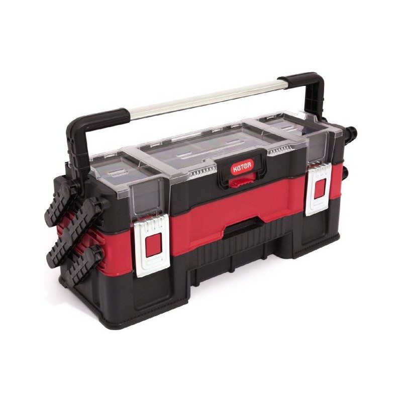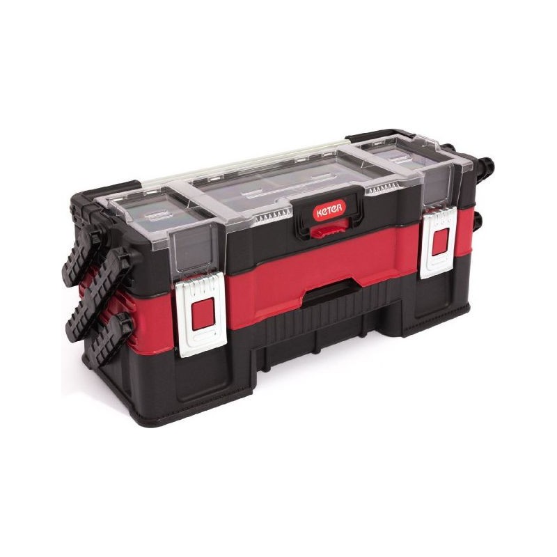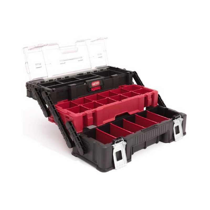 - Die mehrstufige Konstruktion gewährleistet einen einfachen Zugriff auf Kleinteile und Werkzeuge, der transparente Deckel ermöglicht den Blick auf den Inhalt der obersten Ebene.