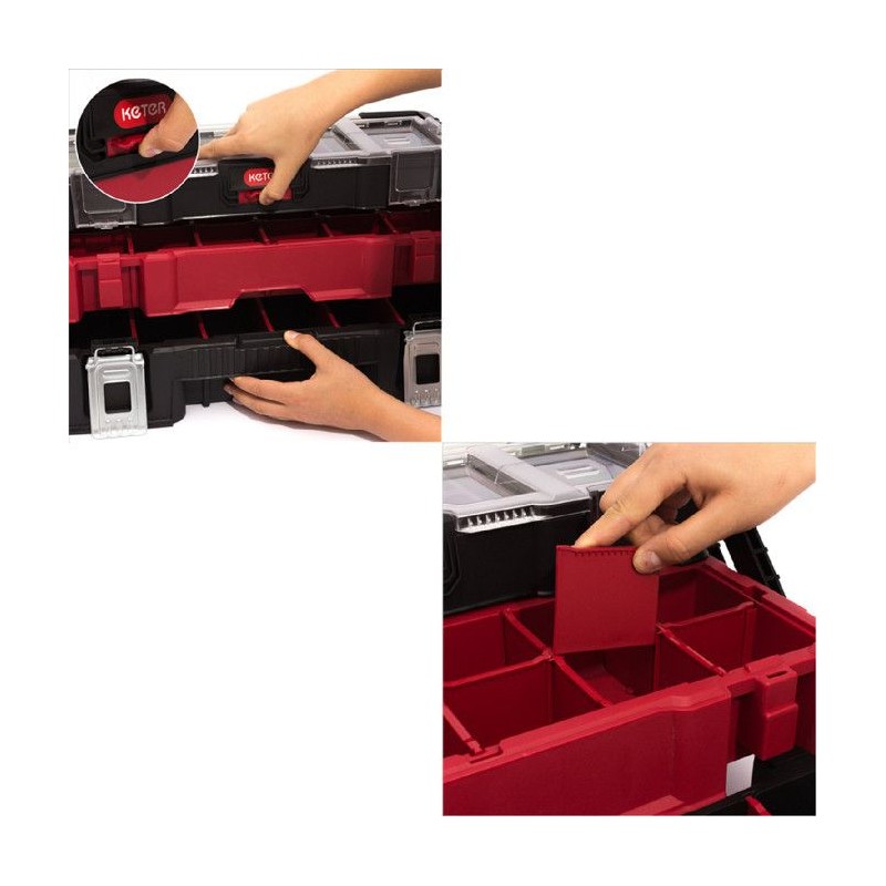 - Herausnehmbare Trennwände ermöglichen eine effizientere Organisation von Werkzeugen und Kleinteilen und lassen sich an die jeweilige Arbeit anpassen.