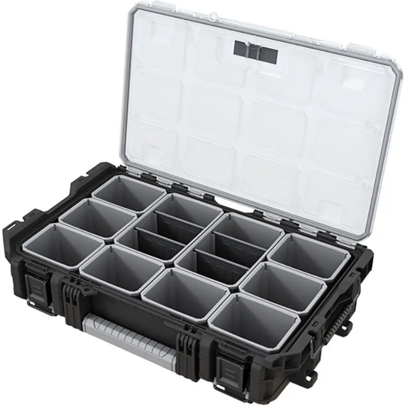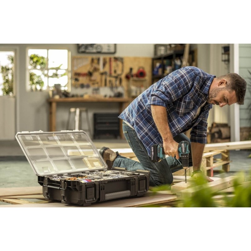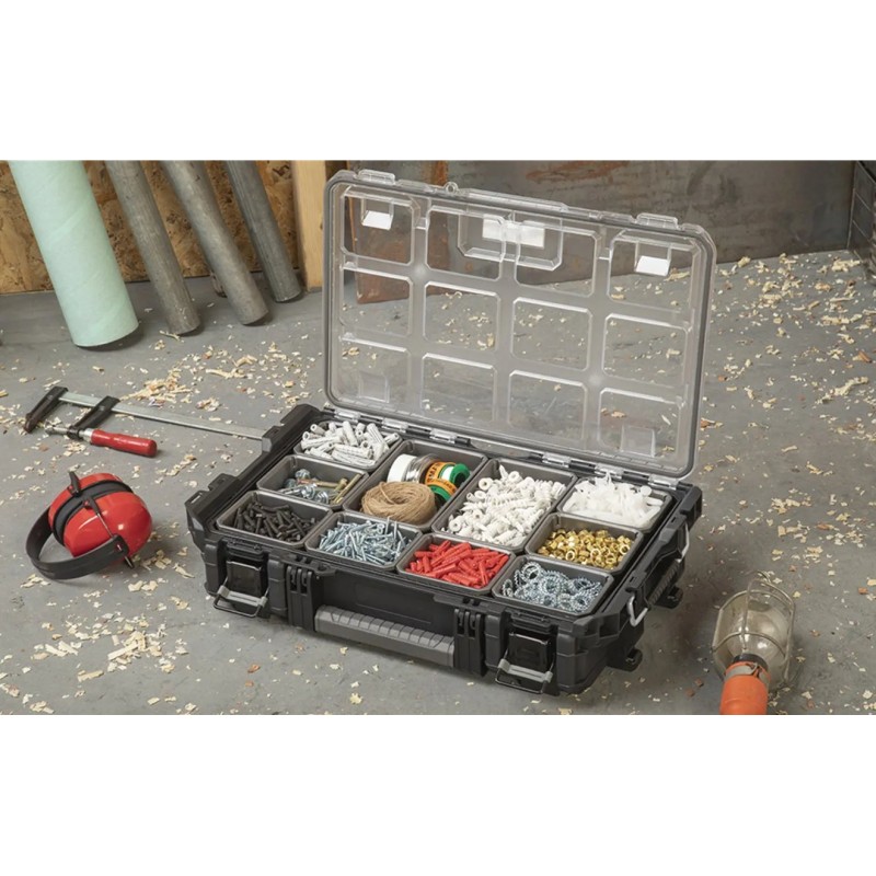 Der Keter ROC PRO GEAR 1.0 Organizer ist eine hervorragende Möglichkeit, Ordnung am Arbeitsplatz zu schaffen. Im Inneren befinden sich 8 kleine und 2 größere herausnehmbare Behälter, die zur Aufbewahrung von Kleinzubehör und Teilen dienen. Der transparente Deckel schützt den Inhalt und ermöglicht es, den gesuchten Gegenstand leicht zu finden, ohne den Organizer öffnen zu müssen. Darüber hinaus verhindert eine zusätzliche Dichtung das Eindringen von Staub und Wasser. Das modulare System ermöglicht es, die Box mit anderen Produkten der ROC PRO GEAR-Reihe zu kombinieren, wodurch ein individuelles Aufbewahrungssystem für Werkzeuge und Zubehör geschaffen werden kann.