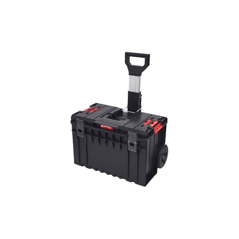 Ein großer Werkzeugkasten auf Rädern, der für hervorragende Mobilität der modularen Qbrick-Systeme sorgt. Zwei mit Gummi überzogene Laufräder, die auf einer Metallachse montiert sind, ermöglichen den sicheren Transport selbst umfangreicher Sets. Ein teleskopierbarer Aluminiumgriff, der sich beim Öffnen des Deckels mitbewegt, gewährleistet einen bequemen Zugang zum Innenraum des Kastens.
