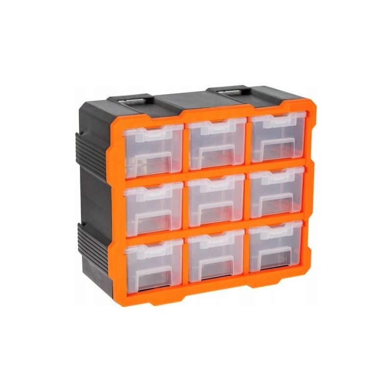 Geräumiger Werkstatt-Organizer mit 9 Behältern – ideal zur Aufbewahrung von Werkzeugen und Zubehör in der Garage oder Werkstatt. Er kann als Standmodell oder an der Wand befestigt verwendet werden und passt sich so an verschiedene Räumlichkeiten an.