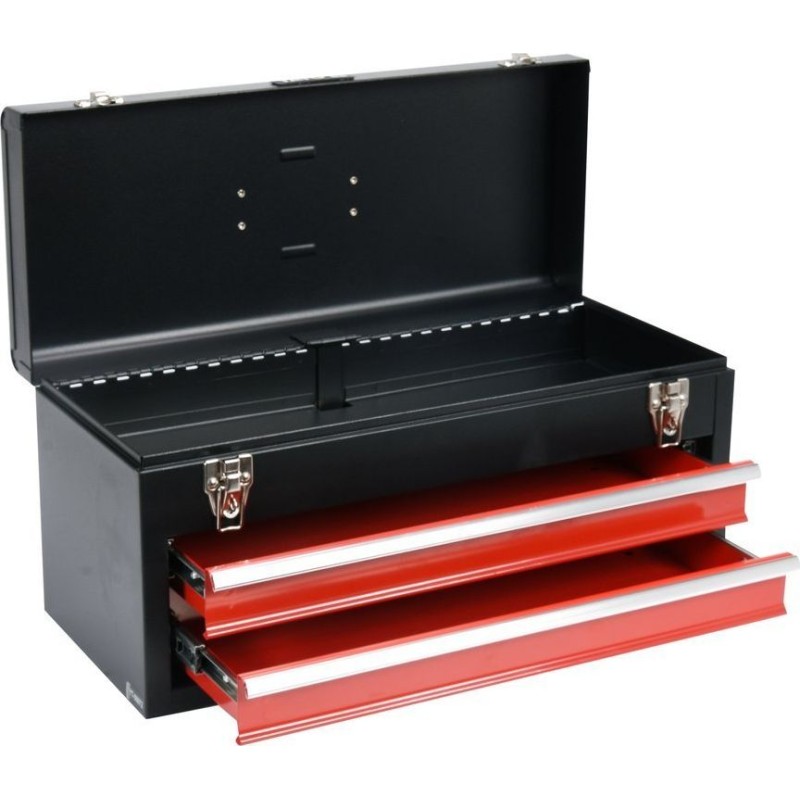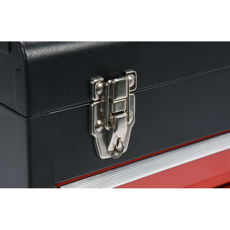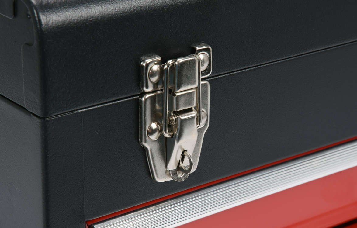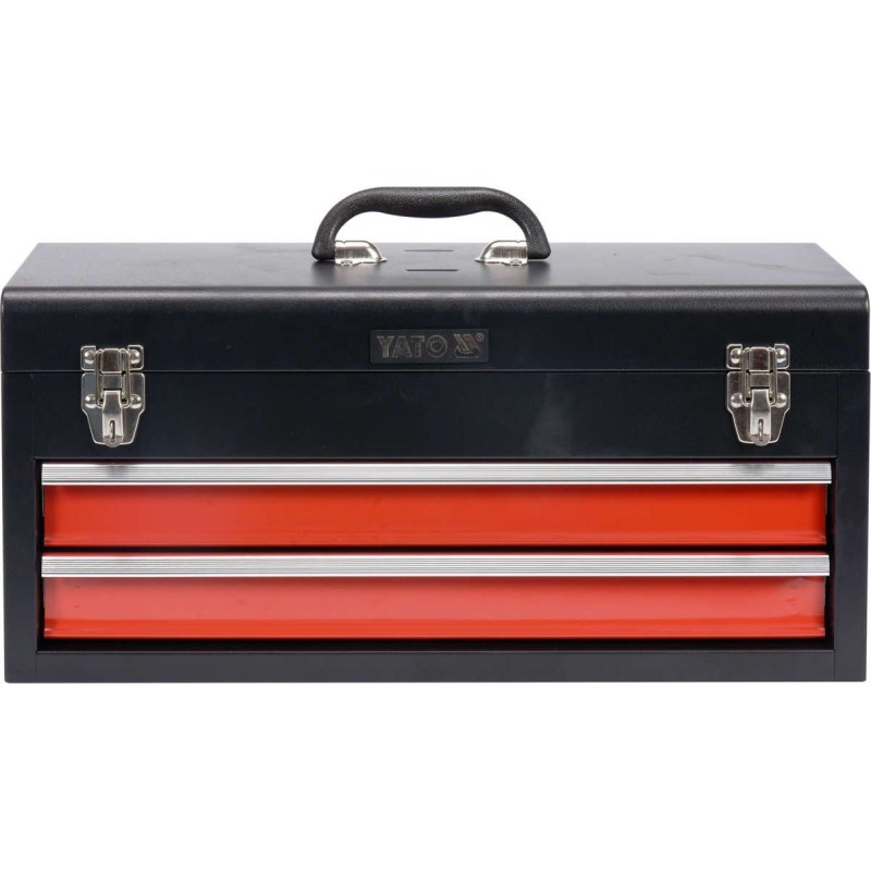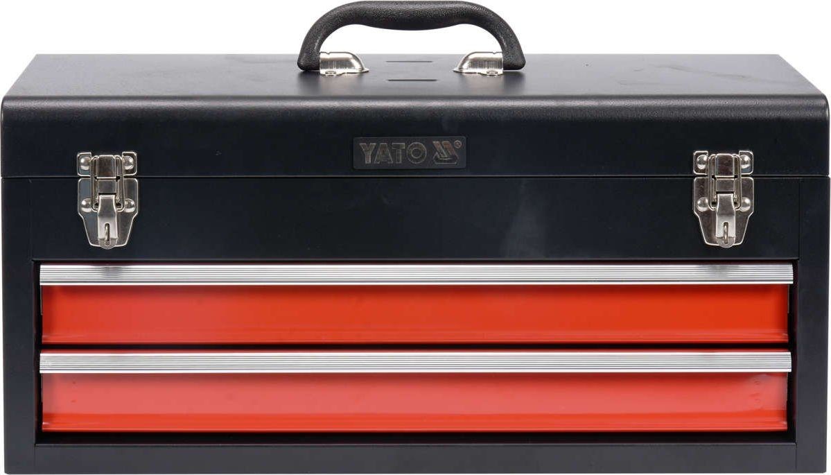 YATO-Kiste für Handwerkzeuge, ausgestattet mit Schubladen auf Metallkugelführungen. Sie verfügt über ein zusätzliches oberes Staufach, das mit Metallverschlüssen verschlossen werden kann.