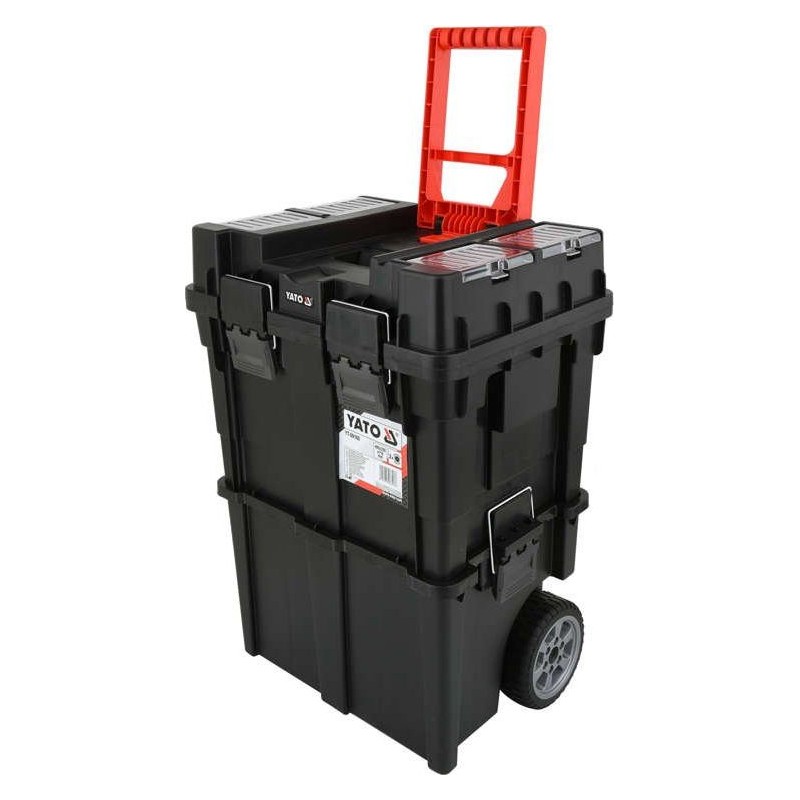 Der Werkzeugkasten YT-09160 hat die Form eines zweiteiligen Rollwagens zur Aufbewahrung von Werkzeugen und Zubehör. Ideal für Profis und Heimwerker.