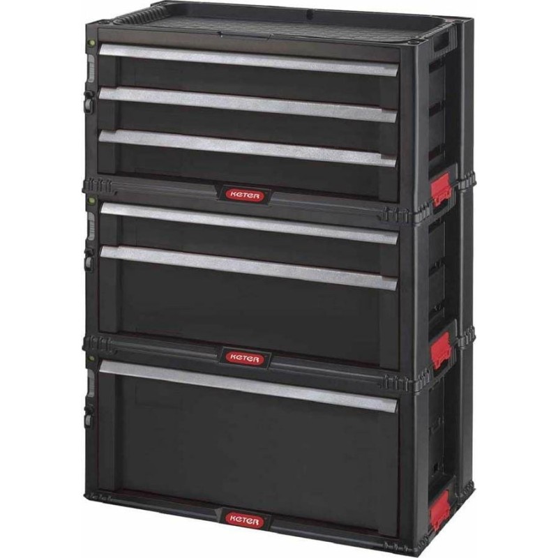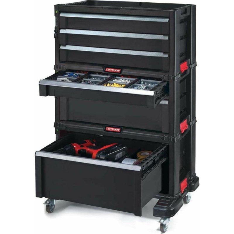 - Profis schätzen die Funktionalität, das große Fassungsvermögen und die kompakte Bauweise des Regals, das Folgendes umfasst: eine tiefe, große Schublade mit herausnehmbaren Trennwänden für größere und schwerere Werkzeuge, eine mittlere Schublade für kleinere Werkzeuge sowie 4 kleinere Schubladen für Kleinteile.