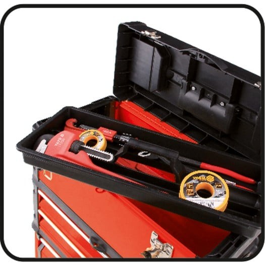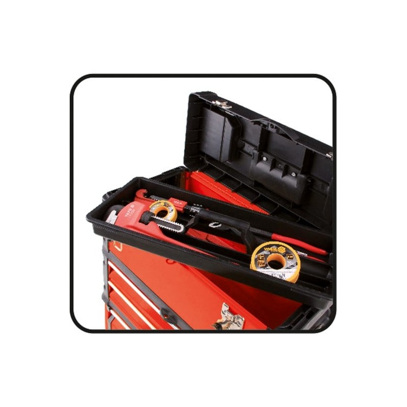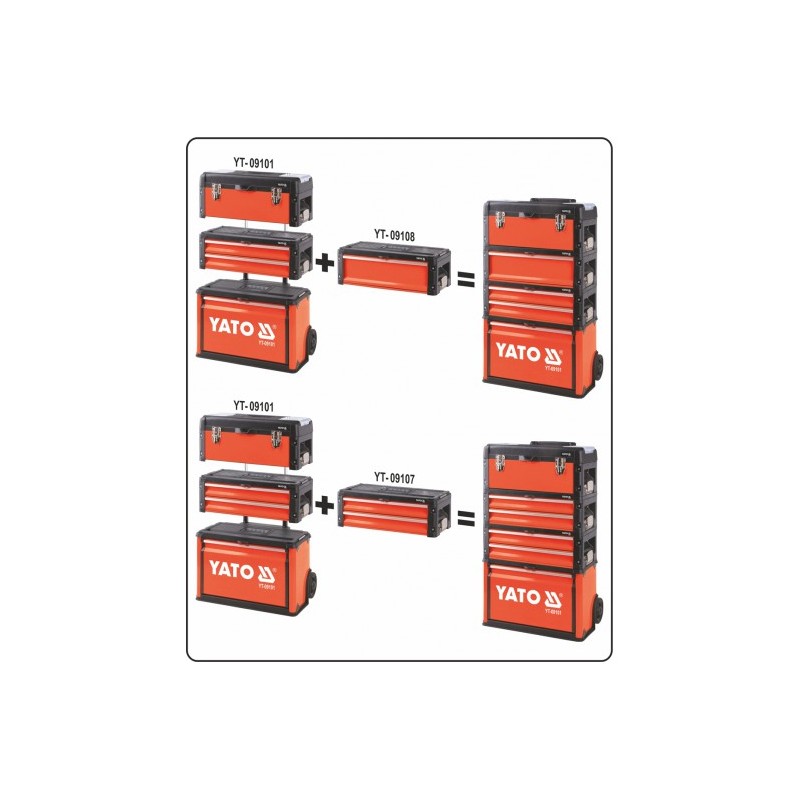 Der Werkzeugwagen ist mit 2 ausziehbaren Organizer-Einsätzen und einer Werkzeugablage ausgestattet. Die Module verfügen über eine flache Arbeitsplatte, die als Arbeitsfläche genutzt werden kann. Darüber hinaus ist er mit einer Nut versehen, die beim Bohren oder Schrauben sehr nützlich ist. Außerdem verfügen die Module über einen bequemen, rutschfesten Griff, seitliche Haltegriffe zum leichteren Anheben sowie rutschfeste Eckstücke an der Unterseite. Es besteht die Möglichkeit, das 3-Modul-Set durch Hinzufügen eines mittleren Moduls YT-09107 oder YT-09108 zu einem 4-Modul-Set zu erweitern. Die oberen und mittleren Module verfügen über Metallverschlüsse zum Zusammenfügen zu Sets, und der Aluminiumgriff ist zusätzlich mit einer Verriegelung ausgestattet, die die Module sichert