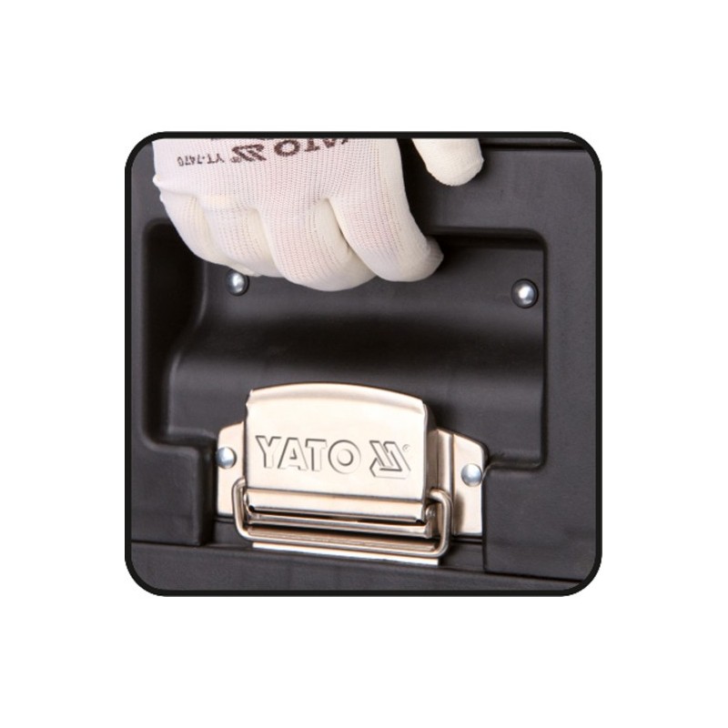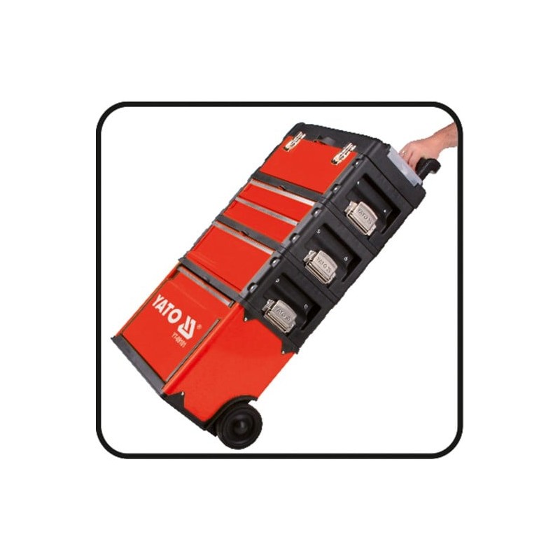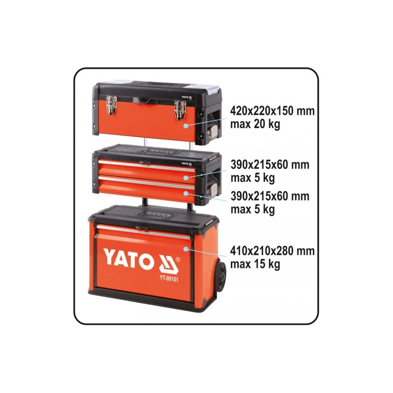Die Schubladen sind auf Metallschienen mit Kugellagern montiert. In die Schubladen können YATO-Werkzeugtrays mit vorgefertigten Werkzeugsätzen eingesetzt werden. Das Set umfasst einen unteren Kasten mit integrierten Rollen, einem ausziehbaren Aluminiumgriff und einer großen Klappschublade. Die Tragkraft des unteren Moduls beträgt 15 kg, die Abmessungen betragen 410 x 210 x 280 mm. Das mittlere Modul verfügt über 2 Metallschubladen mit einer Tragkraft von jeweils 5 kg und Abmessungen von jeweils 390 x 215 x 60 mm. Das obere Modul ist ein klassischer Werkzeugkasten mit den Abmessungen 420 x 220 x 150 mm und einer Tragkraft von 20 kg.