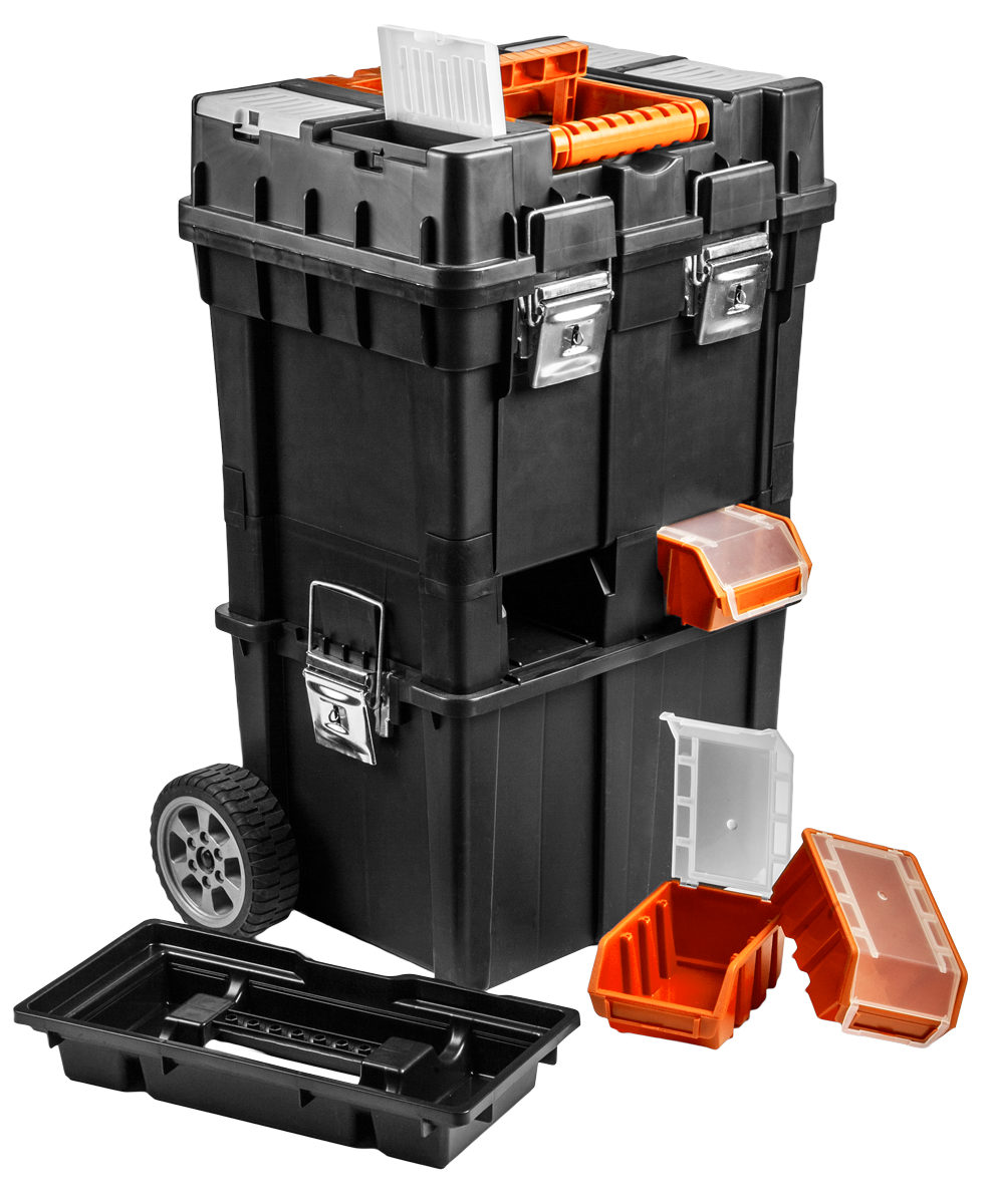 Die geräumige und mobile Werkzeugwerkstatt besteht aus strapazierfähigem Kunststoff mit Metallverschlüssen. Sie ist mit Rädern ausgestattet, um den Transport zu erleichtern. Die Werkstatt besteht aus 3 funktionalen Elementen, die in einzelne Module zerlegt werden können. Der obere Teil besteht aus einem Werkzeugkasten, das mittlere Modul aus vier Ergoboxen und der untere Teil aus einer geräumigen Kiste für größere Werkzeuge. Die Werkstatt verfügt außerdem über 4 Organizer zur Aufbewahrung von Kleinteilen, eine Innenschale und zwei praktische Griffe zum Tragen oder Ziehen.