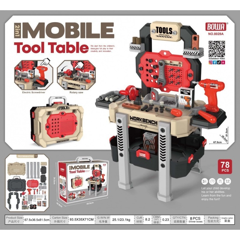 - Koffer ca. 45 cm x 34 cm x 16 cm, - Werkzeugständer ca. 67,5 cm x 81,5 cm x 36,5 cm, - Bohr- und Schraubmaschine mit austauschbarer Spitze ca. 16 cm x 15 cm x 5 cm, - Säge ca. 14 cm x 13 cm x 4 cm, - Hammer ca. 8,5 cm x 14 cm x 3 cm, - Kreuzschlitzschraubendreher ca. 13,5 cm x 3,5 cm, - Steckschlüssel 11,5 cm x 6 cm, - Einstellbarer Schraubenschlüssel ca. 13,5 cm x 5 cm, - Ölkanister ca. 6,5 cm x 4 cm, - Schachteln ca. 10 cm x 7 cm x 3 cm, - Verpackung ca. 46 cm x 34,5 cm x 17 cm. |