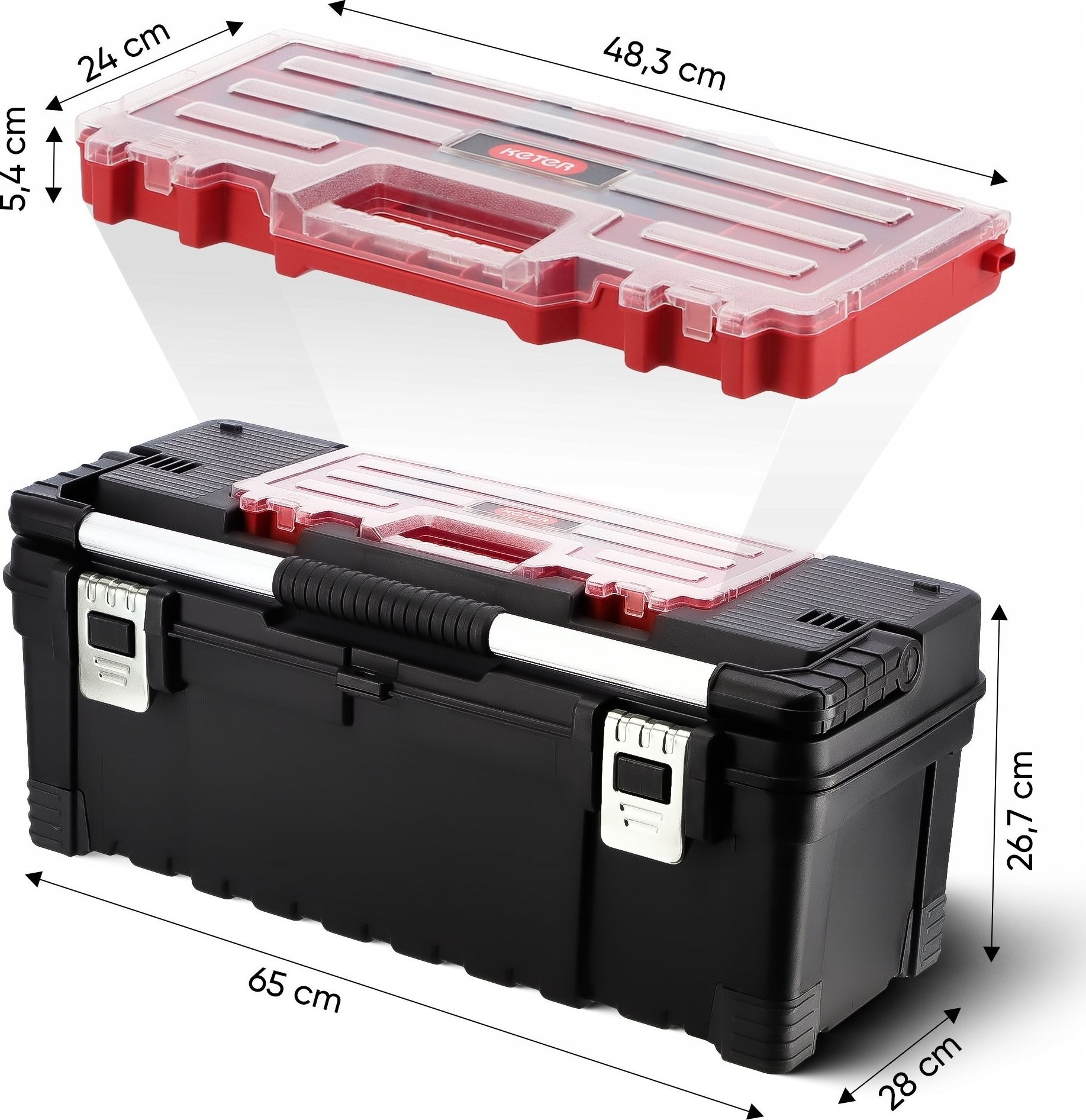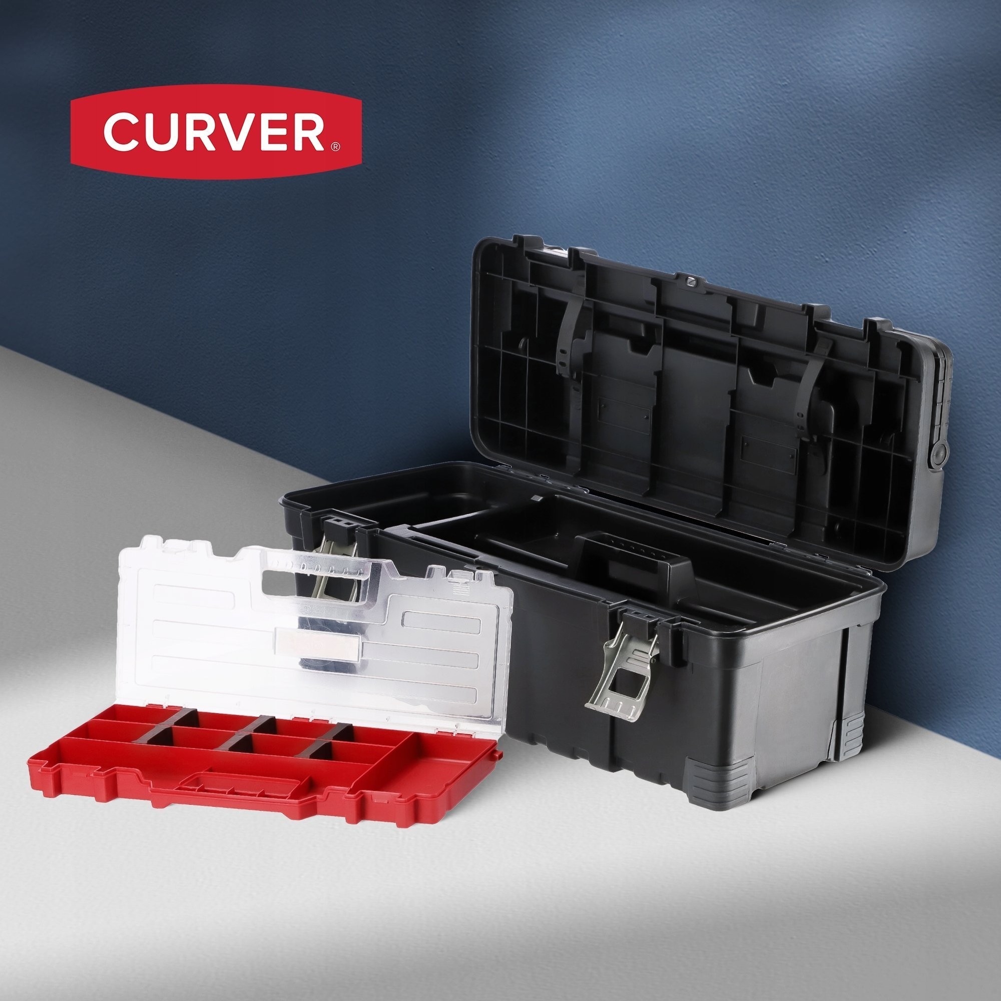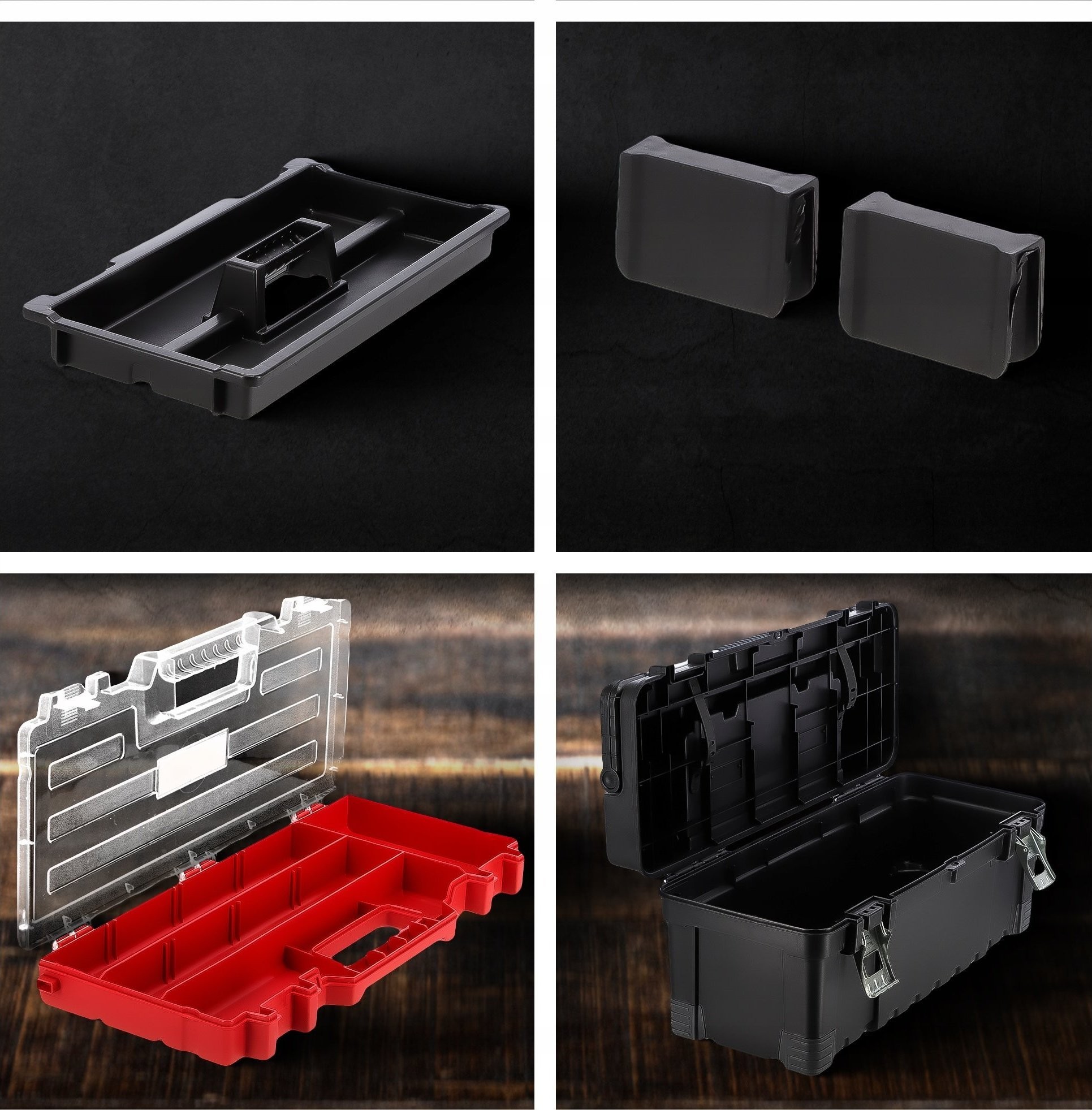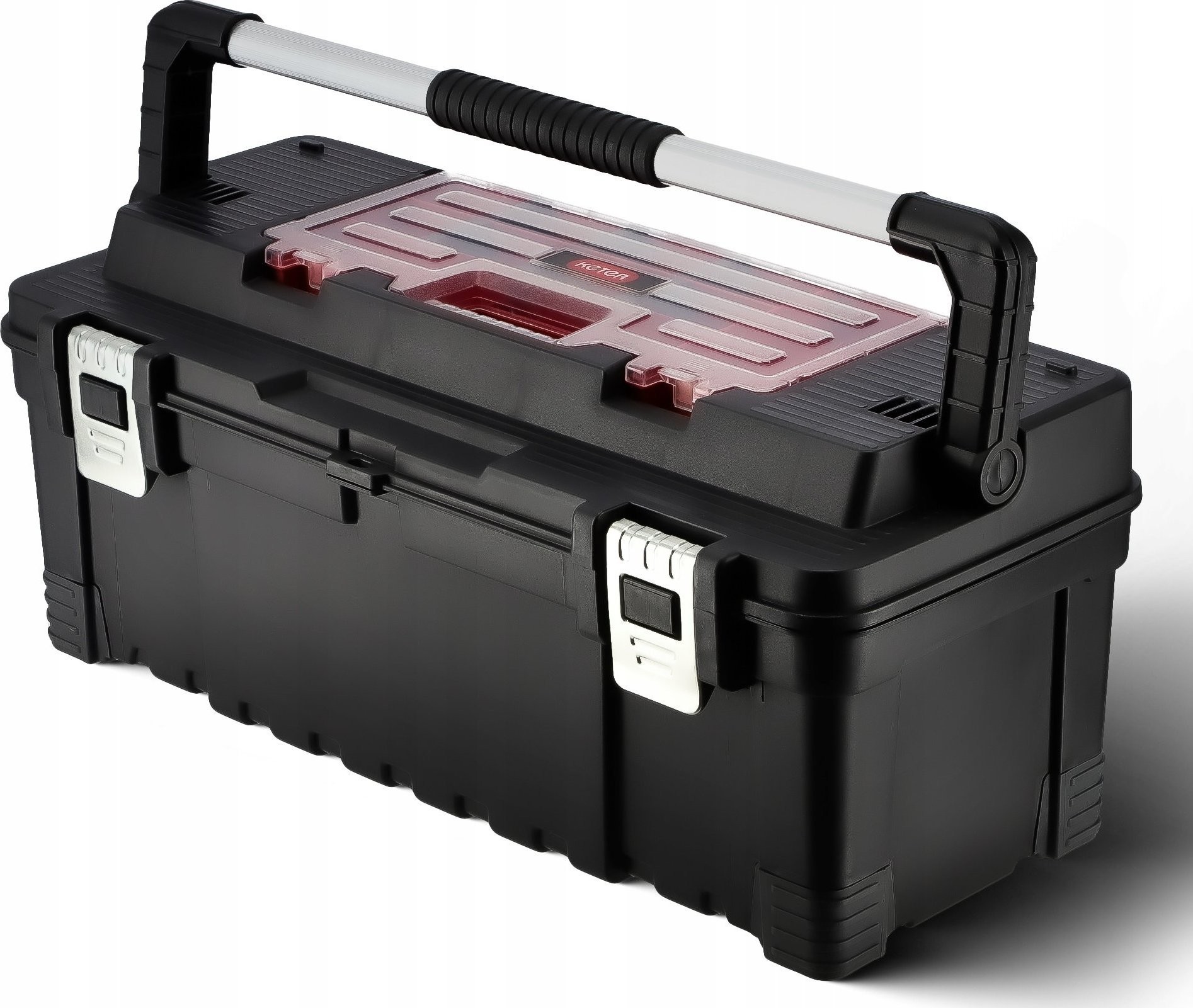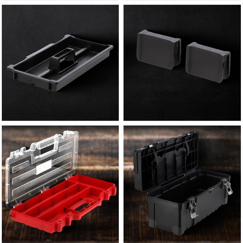 Unsere Werkzeugkiste ist robust, da sie aus hochwertigem Kunststoff gefertigt wurde. Das Material ist widerstandsfähig gegen Stöße und Verformungen, wodurch die Kiste ihre Eigenschaften langfristig beibehält. Die Verschlüsse und der seitliche Griff sind aus Metall gefertigt.