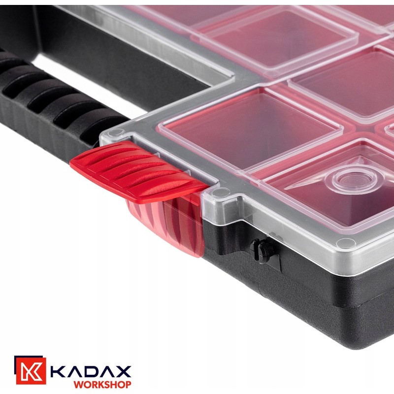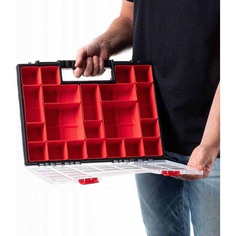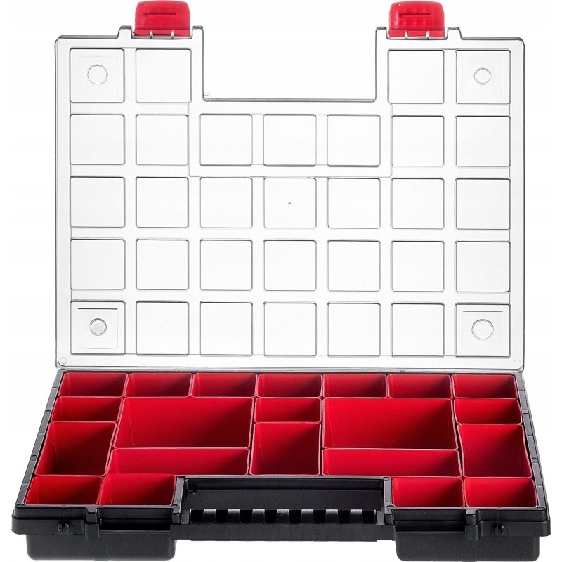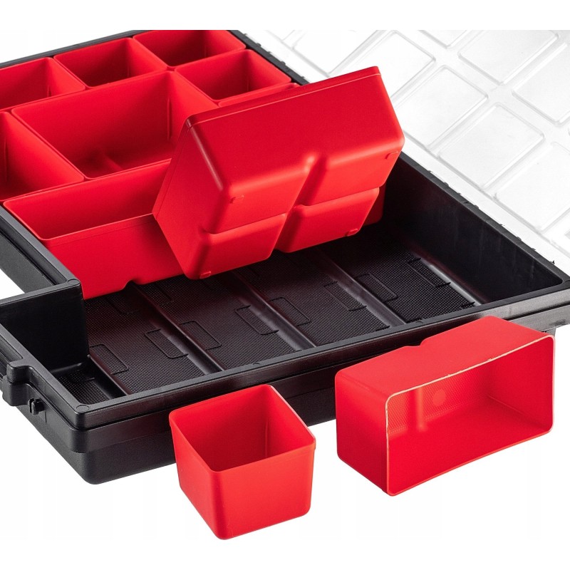 ROBUST – Der Korpus und der transparente Deckel bestehen aus robustem Kunststoff. Der Werkzeugorganizer verfügt über stabile Verschlüsse, die den Deckel sichern und den Inhalt zuverlässig vor unerwartetem Herausfallen schützen.