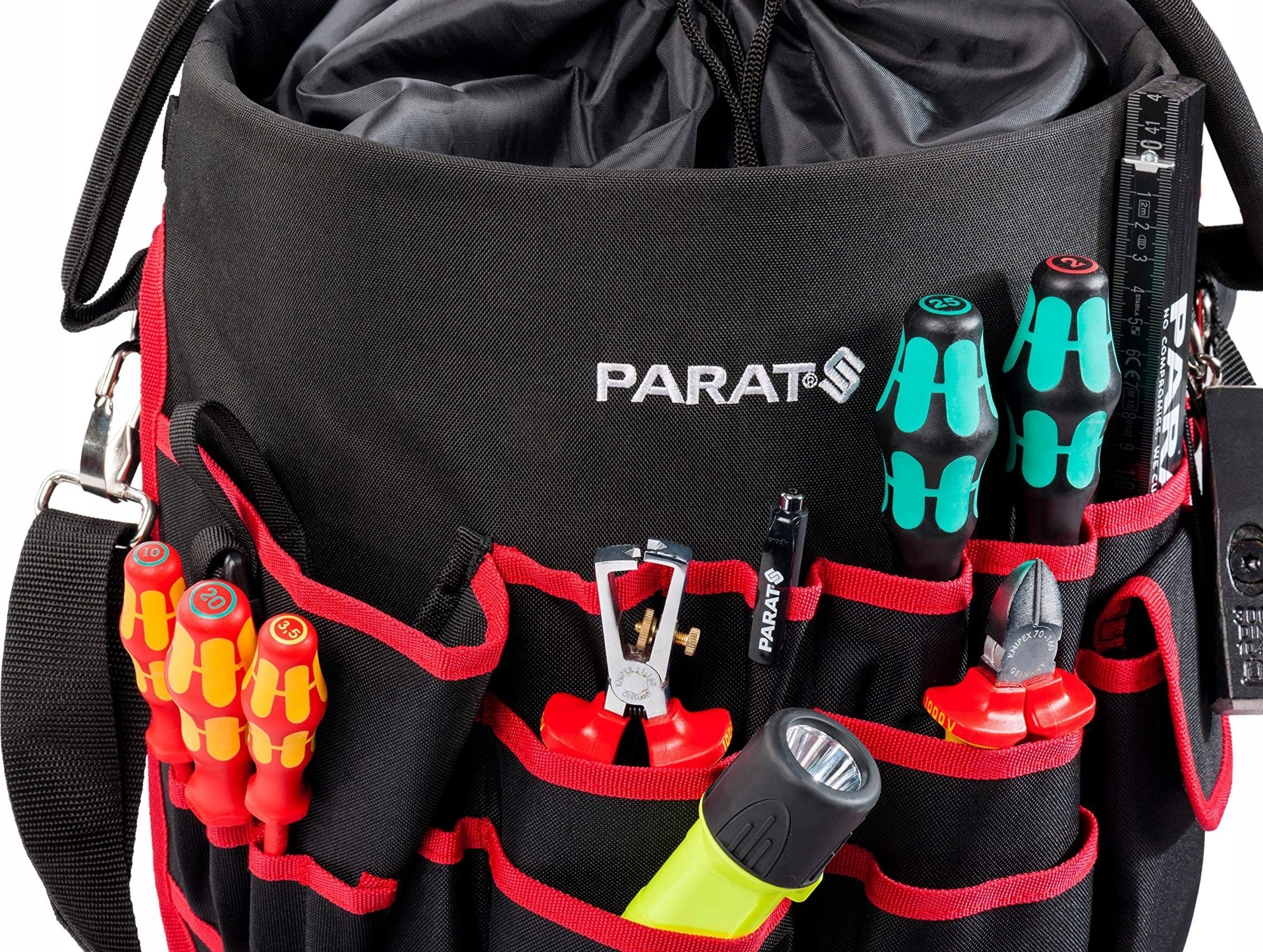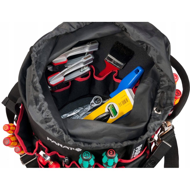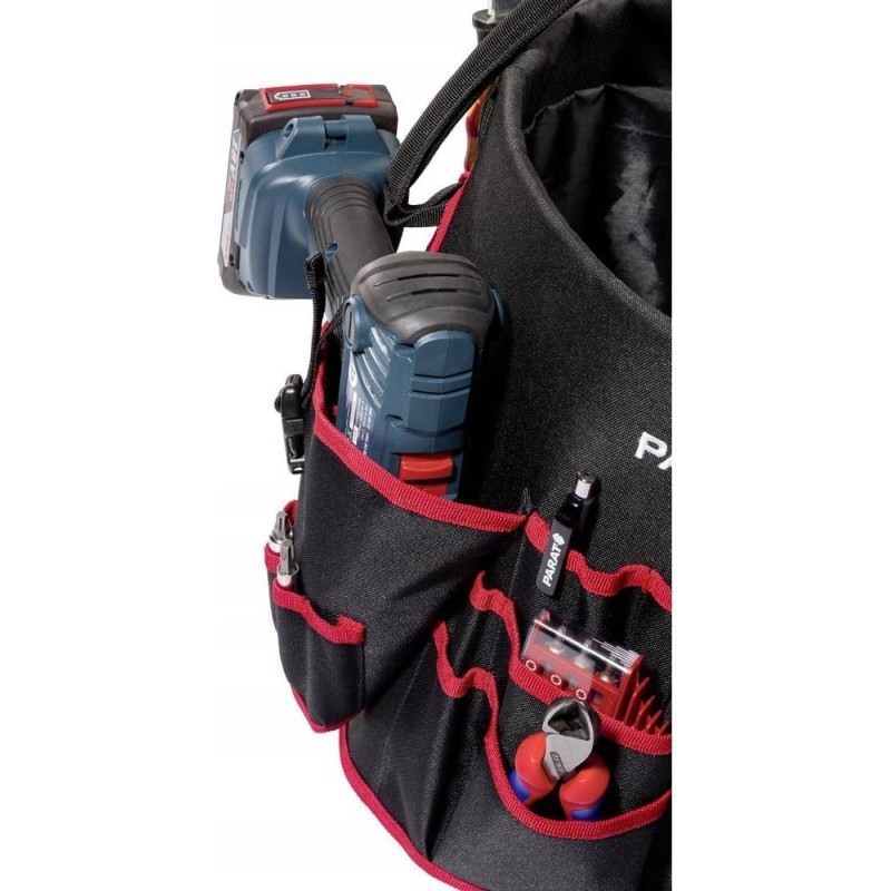 Zusätzlich verfügt die PARAT Basic Tool Bucket Werkzeugtasche über eine Tasche für einen Akku-Schrauber, einen Griff und einen Schultergurt, die einen bequemen Transport der Tasche ermöglichen. Das Set enthält keine Werkzeuge.