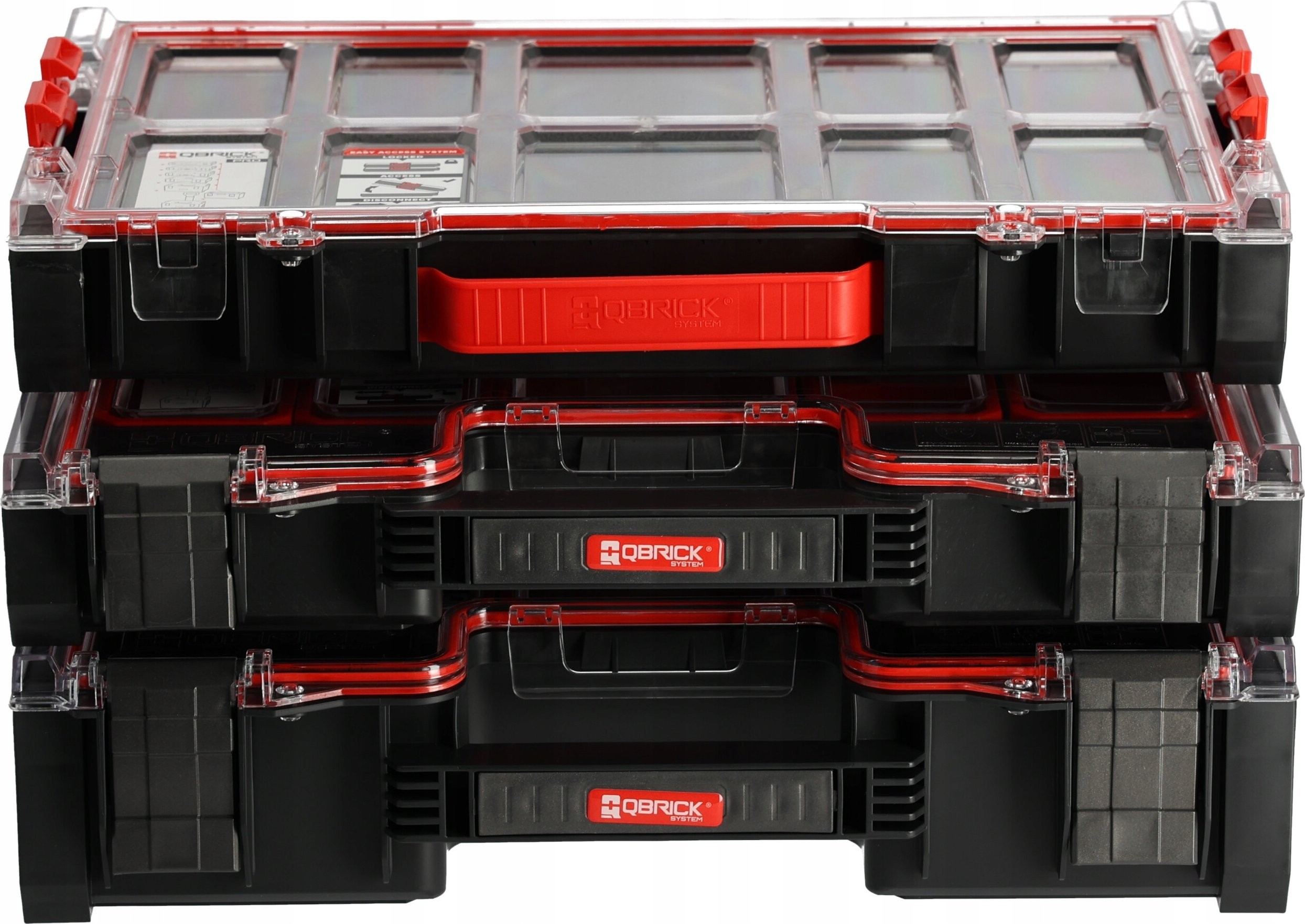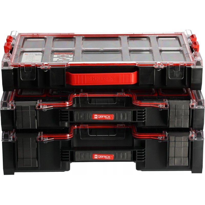 Ein dreiteiliges, umfassendes Organizer-Set aus der Serie Qbrick System PRO, das die Aufbewahrung von Kleinwerkzeugen und Zubehör erleichtert.