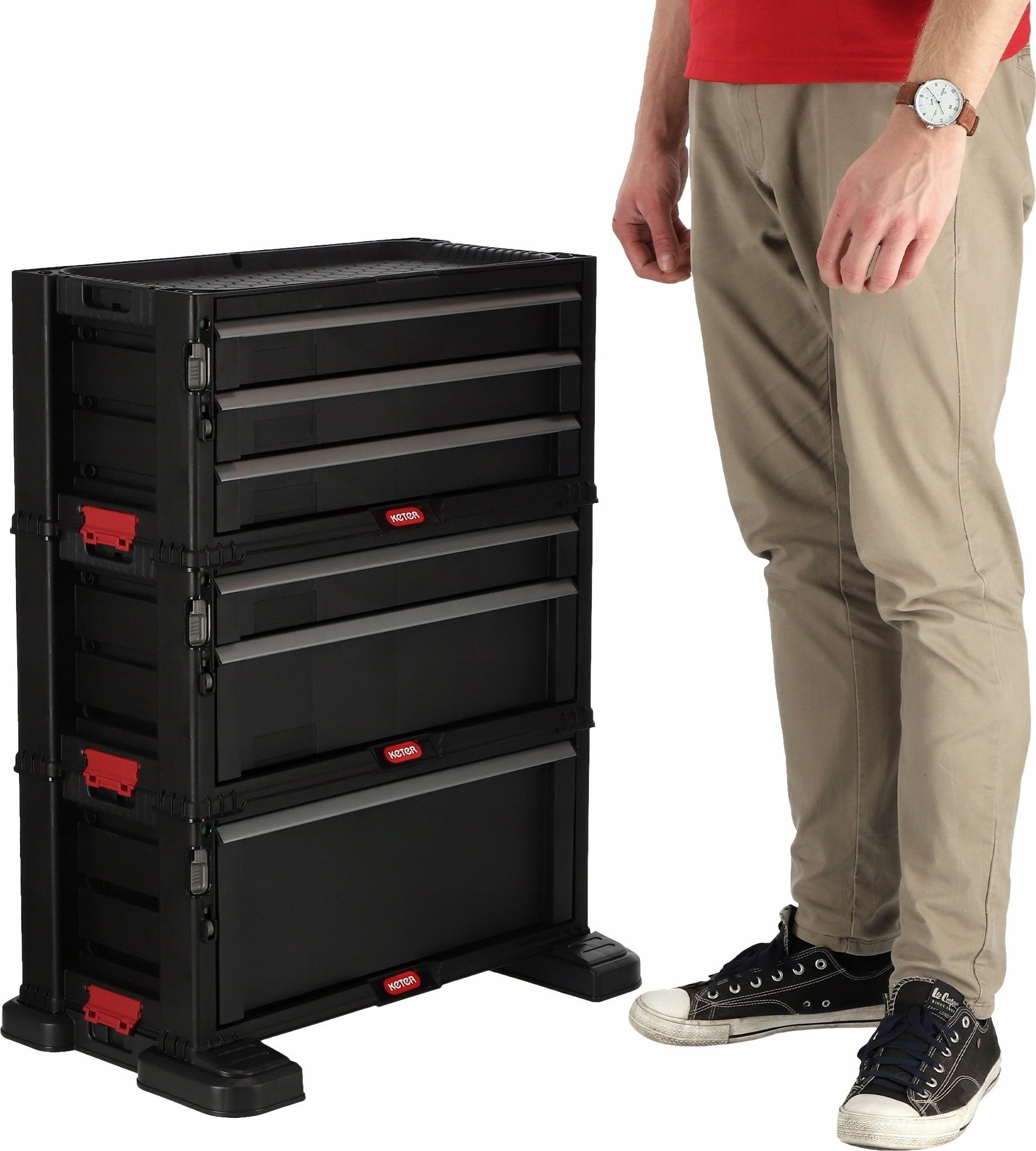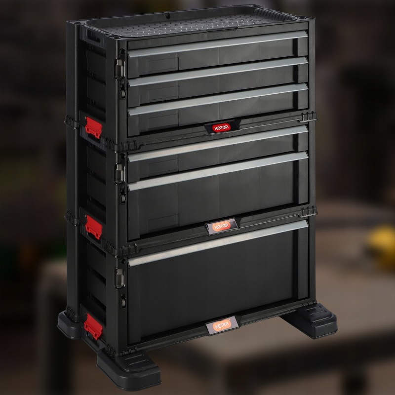 Unser Werkzeugschrank ist aus strapazierfähigem und widerstandsfähigem Kunststoff gefertigt, sodass dir das mobile Regal viele Jahre lang gute Dienste leisten wird. Alle festen und beweglichen Teile sind solide miteinander verbunden, wodurch die Schubladen leichtgängig sind und sich der Schrank problemlos verschieben lässt.