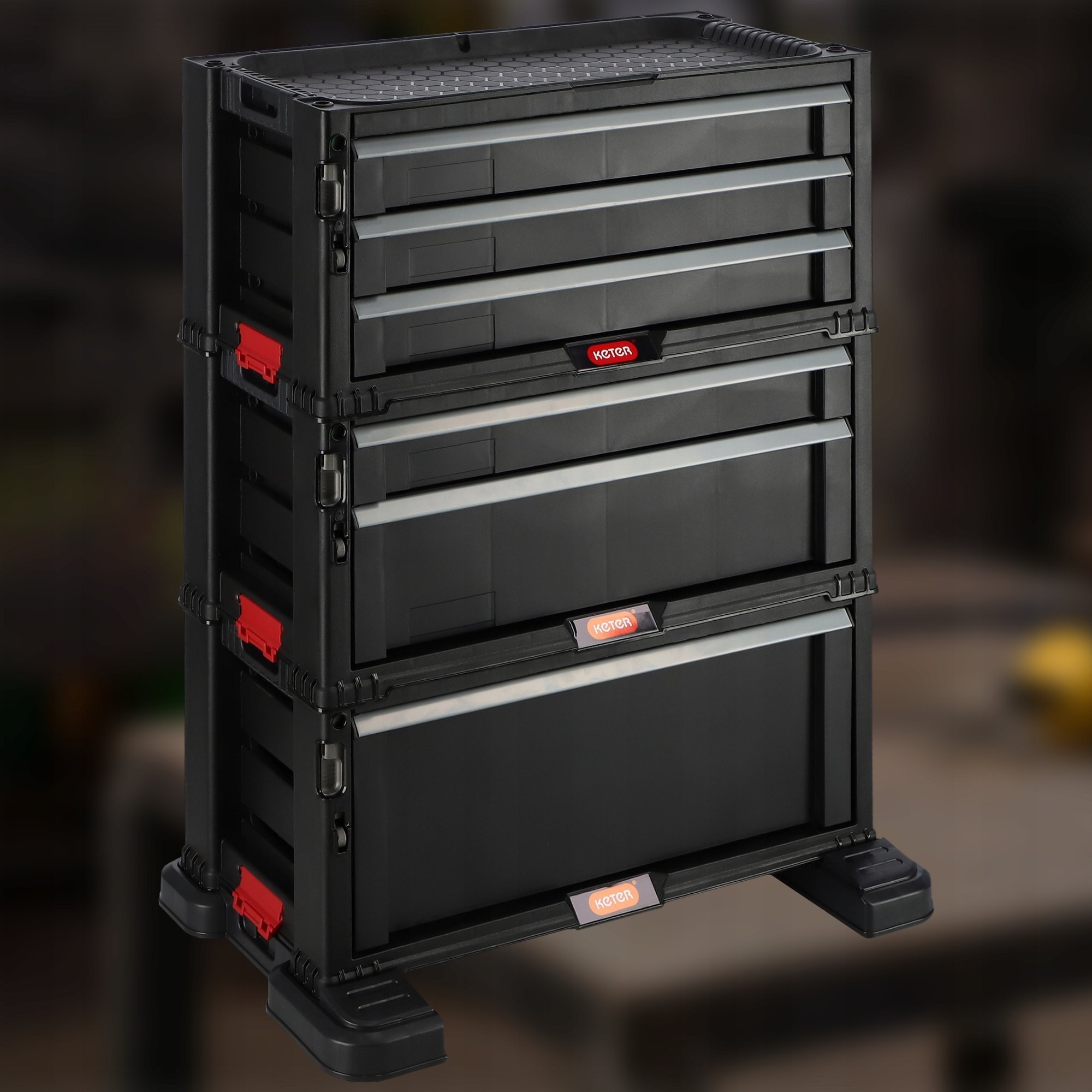 Funktionale Fächer und Behälter aus robustem Kunststoff sorgen für Ordnung und schnellen Zugriff auf die Dinge, die Sie benötigen. Kurz gesagt: Sie haben alles griffbereit, vermeiden Unordnung und können Ihre Arbeit und Ihr Heimwerken effizienter erledigen.