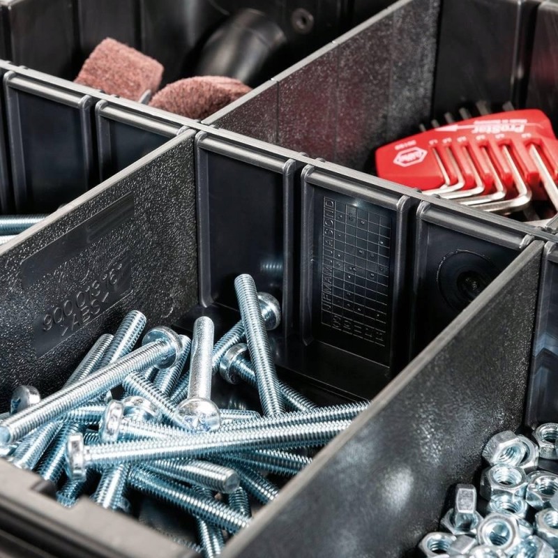 - Mit robusten Werkzeugplatten aus Con-Pearl® (kratzfest, formstabil, beständig gegen Feuchtigkeit, Fette und Chemikalien)