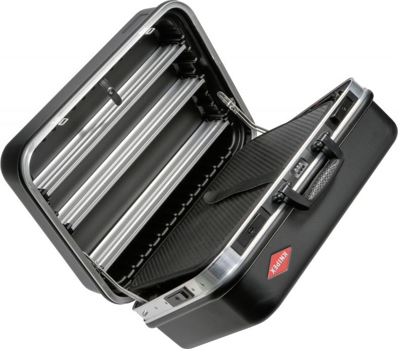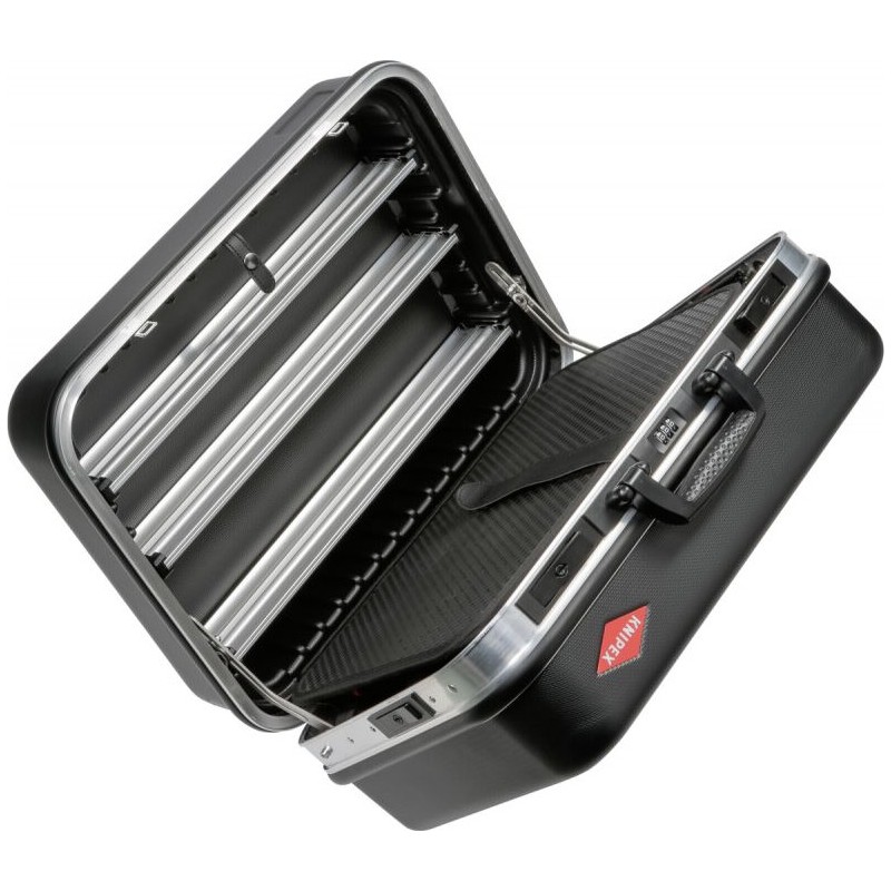 - Umlaufender Aluminiumrahmen mit fest montierter, stabiler Mittelwand, die beidseitig mit Werkzeugen bestückt werden kann, mit universellen Möglichkeiten zur Ergänzung der Kofferausstattung dank flexibler Schlaufenhalterungen und zwölf kleiner Taschen