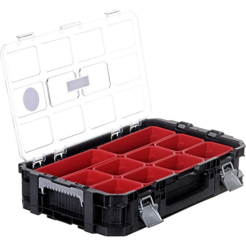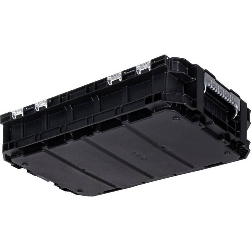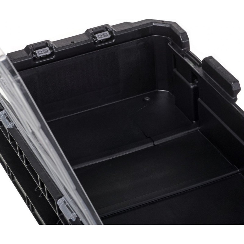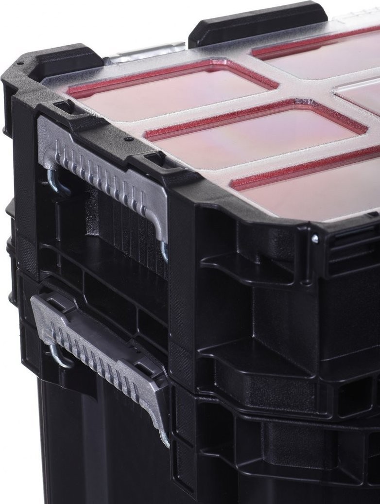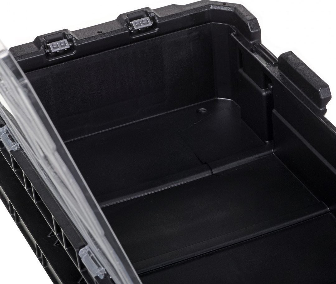 Es verfügt über robuste Verriegelungen für die Stapelung, einen Werkzeugkasten und einen Behälter mit Fächern für Kleinteile.