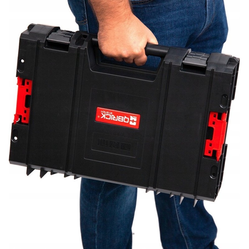 Ein mobiles, zweiteiliges Werkzeugkisten-Set für den komfortablen Transport von Elektrowerkzeugen, Handwerkzeugen und Zubehör. Das Gesamtfassungsvermögen beider Kisten beträgt 39 Liter. Die untere Kiste ist mit zwei Einlegeböden ausgestattet, die die Aufbewahrungsmöglichkeiten für die darin befindlichen Gegenstände erweitern. Die obere Box verfügt über eine Polsterung aus weichem Schaumstoff, die den Transport von Spezialwerkzeugen ermöglicht. Seitliche Verbindungselemente sorgen für eine stabile Verbindung der Boxen, wodurch auch der Transport im Auto möglich ist. Der Innenraum jedes Moduls ist dank einer elastischen Dichtung an den Deckeln vor dem Eindringen von Wasser und Staub geschützt.