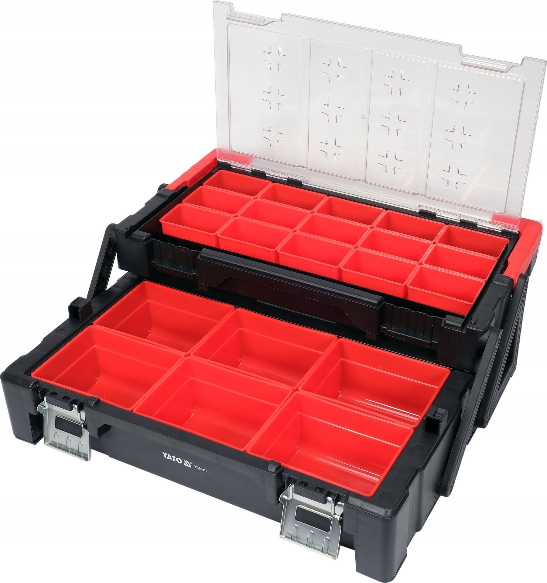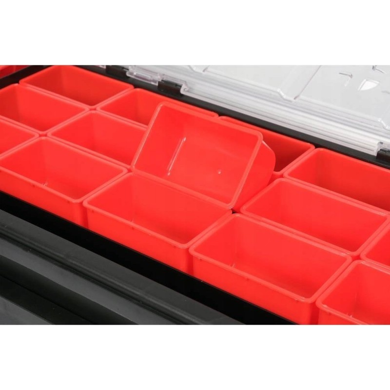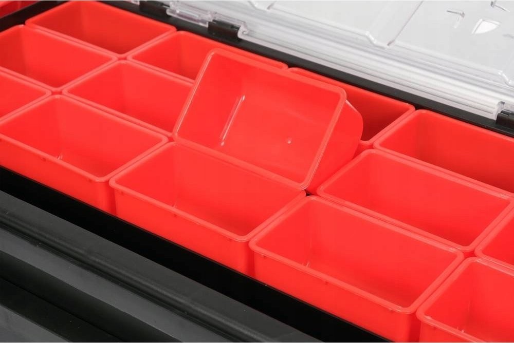 Zusammenklappbarer, zweistufiger Organizer zur Aufbewahrung von Kleinmaterial, das in Werkstatt und Garage benötigt wird.