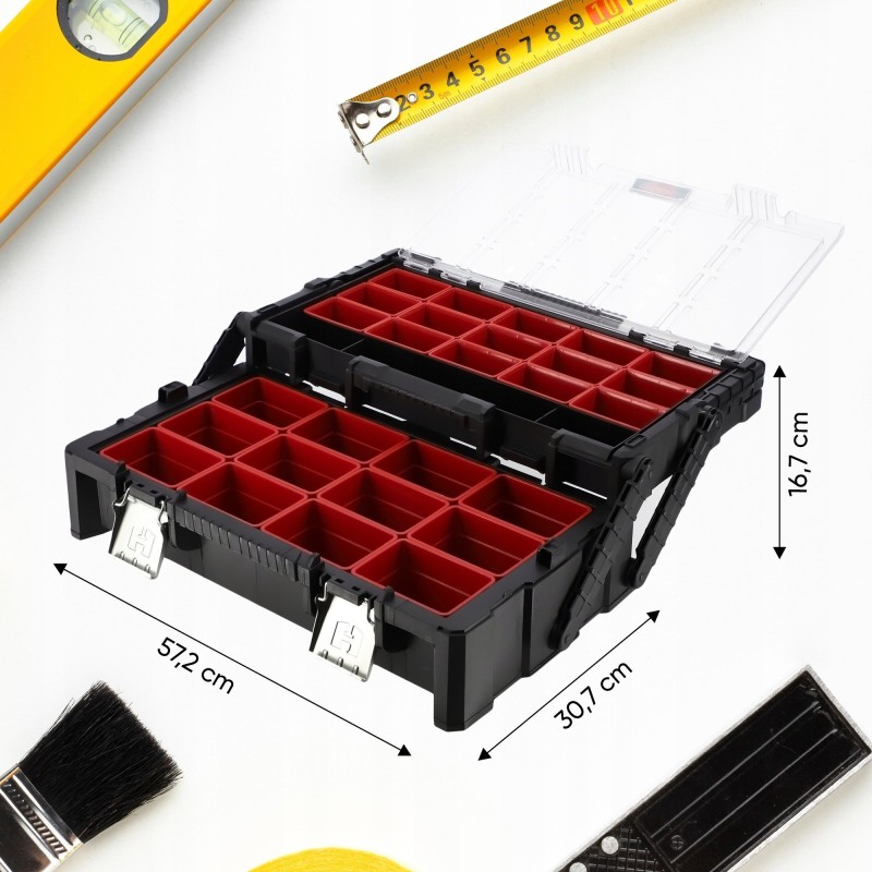 Unser Organizer ist äußerst funktional. Erstens: Er verfügt über geräumige Fächer zur Aufbewahrung Ihrer Nägel, Schrauben, Muttern oder Bleistifte. So haben Sie alle notwendigen Utensilien während der Renovierung griffbereit.