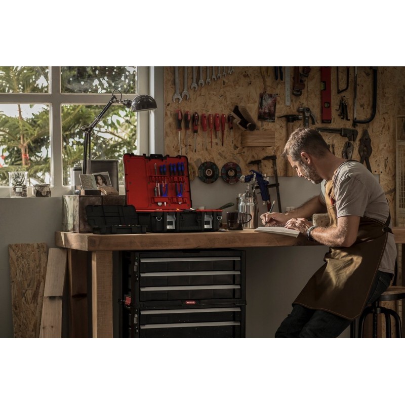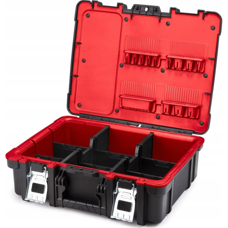 Im Inneren der Kiste befindet sich ein herausnehmbarer Organizer mit 4 Fächern, der einen freien Zugriff auf die Werkzeuge ermöglicht.