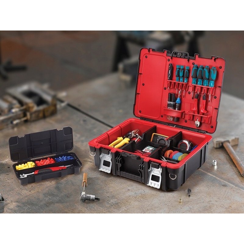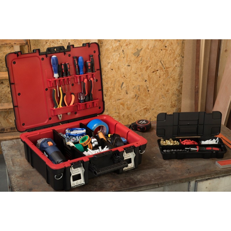 So haben Sie alle notwendigen Utensilien griffbereit – in der Werkstatt, in der Garage oder bei Renovierungsarbeiten. Darüber hinaus schützt der dichte Verschluss in Form von Schnappverschlüssen die Werkzeuge vor dem Herausfallen und somit vor Beschädigungen und Kratzern.
