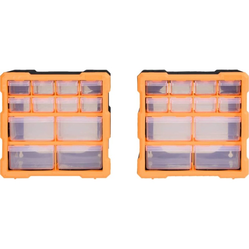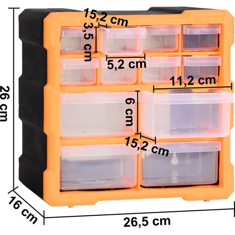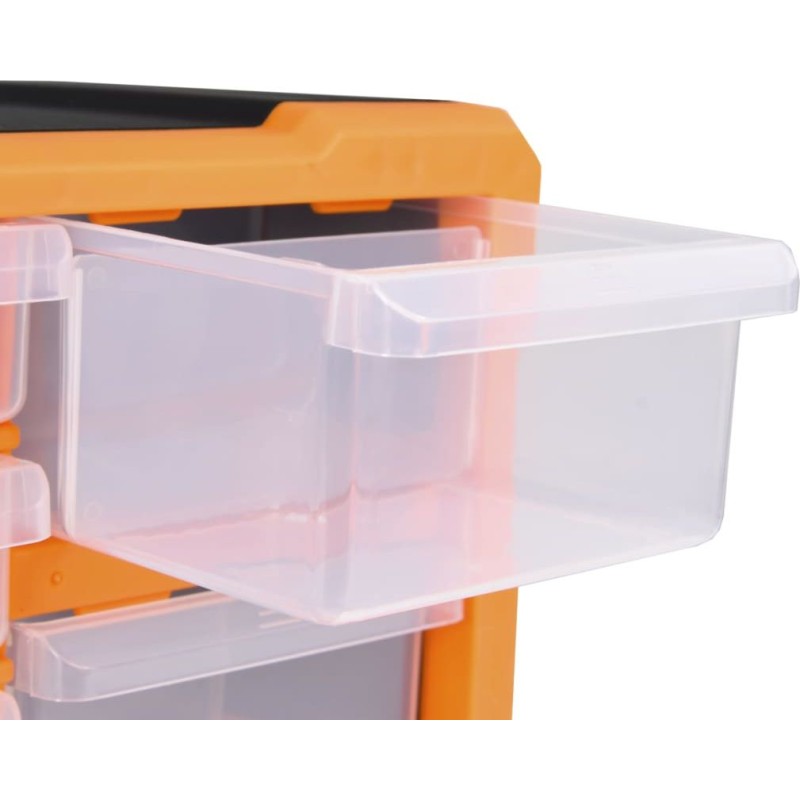 Jeder Aufbewahrungsorganizer enthält 8 kleine und 4 mittelgroße Schubladen, um unterschiedlichen Anforderungen gerecht zu werden. So sind Ihre Handwerkzeuge und Zubehörteile wie Verbindungsstücke übersichtlich angeordnet und griffbereit. Der Werkzeugschrank besteht aus schlagfestem Kunststoff, der langlebig und stabil ist. Die Schubladen aus transparentem Kunststoff ermöglichen eine schnelle Erkennung des Inhalts. Die Box eignet sich ideal zur Aufbewahrung von Muttern, Schrauben, Nägeln, Befestigungselementen und Bauteilen.