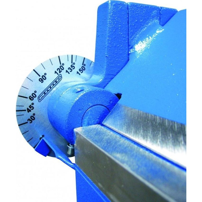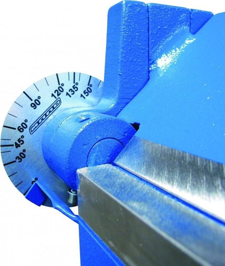 Der Biegevorgang erfolgt durch Drehen des Biegebalkens um einen bestimmten Winkel mithilfe eines Griffs. Ein Winkelmesser, der von vorne gesehen auf der linken Seite der Biegemaschine angebracht ist, zeigt den aktuellen Biegewinkel des Blechs an.