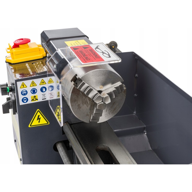 Die Drehmaschine wurde mit Blick auf Langlebigkeit und Sicherheit entwickelt. Ihr Bett aus hochwertigem Gusseisen garantiert hervorragende Verschleißfestigkeit und Stabilität während des Betriebs. Darüber hinaus ist das Gerät mit einer Spritzschutzhaube und einem Not-Aus-Schalter ausgestattet, was die Sicherheit bei der Nutzung erhöht.