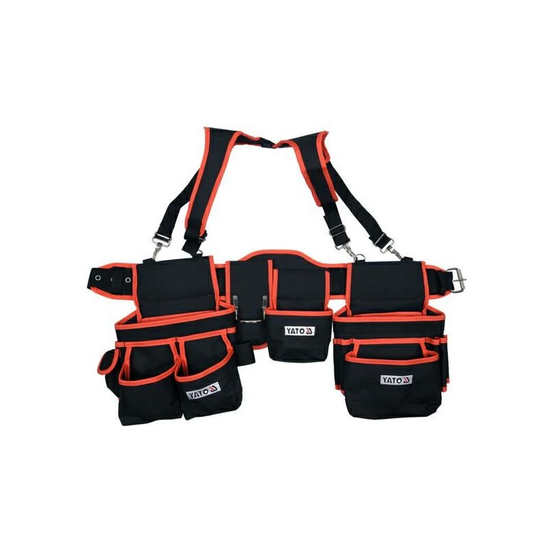 Werkzeuggürtel an Hosenträgern mit zwei aufsteckbaren großen Universal-Taschen, einem Metallhalter für einen Hammer und einer tiefen Tasche für Nägel oder Schrauben. Die Länge des Hauptgurts, der mit einer Metallschnalle geschlossen wird, beträgt ca. 1280 mm. Er ist mit einem breiten Tragegurt verbunden, der an breiten Hosenträgern befestigt ist. Die Hosenträger verteilen die Last und verlagern sie von den Hüften auf die Schultern. Diese Konstruktion des Gürtels erleichtert die Arbeit mit schwereren Lasten. Das gesamte Produkt ist aus dem technischen, wasserabweisenden Polyestergewebe OXFORD 600D gefertigt.