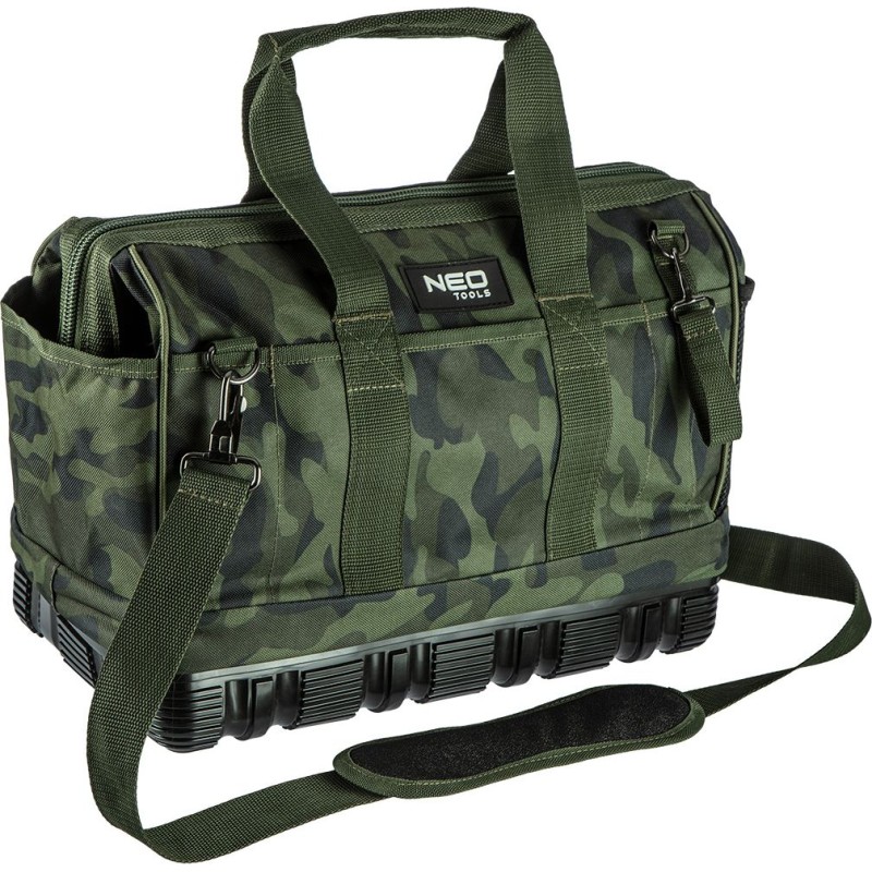 Die Werkzeugtasche CAMO NEO mit den Maßen 40 x 22 x 33 cm. Hergestellt aus 600-D-Nylon, das eine lange Lebensdauer der Tasche garantiert. Sie verfügt über einen verstärkten, wasserdichten Boden, der den Inhalt bei Arbeiten unter schwierigen Bedingungen schützt. Die Tasche ist mit einem robusten Griff und einem Tragegurt ausgestattet.