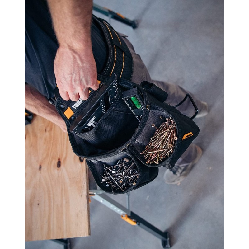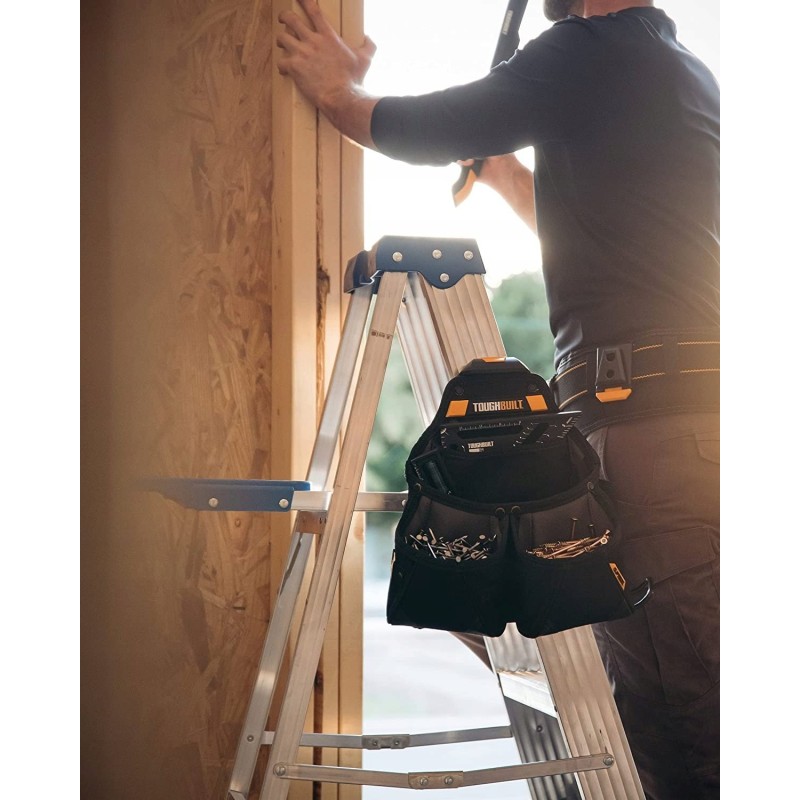 Die ToughBuilt-Werkzeugtasche TB-CT-02 verfügt über das ClipTech-Befestigungssystem, das an jedem ToughBuilt-Werkzeuggurt oder jeder ToughBuilt-Schiene angebracht werden kann. Ein unbestreitbarer Vorteil dieses Modells ist die starre Stütze, die es ermöglicht, die Tasche senkrecht auf den Boden zu stellen, um freien Zugang zu den Werkzeugen zu haben.