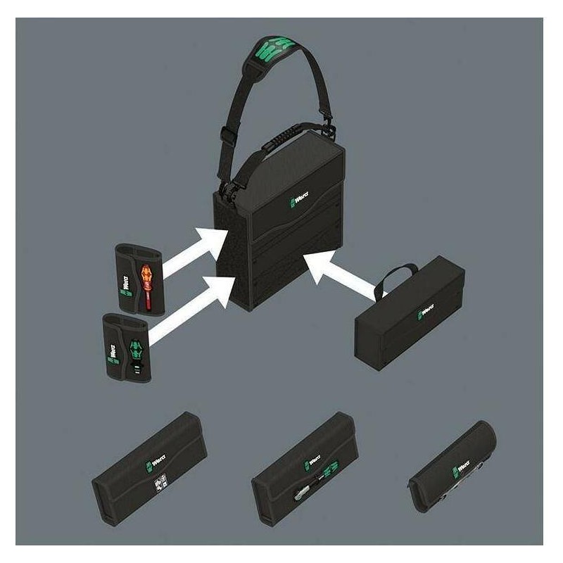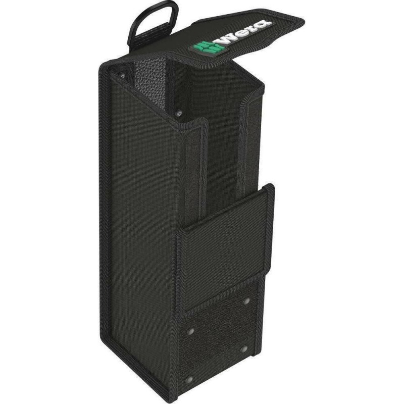 Hohe Werkzeugtasche zur Aufbewahrung und zum Transport von langen Werkzeugen und Ersatzteilen. Hohe Schnitt- und Durchstoßfestigkeit. Geeignet für die Andockung am Wera 2go-System.