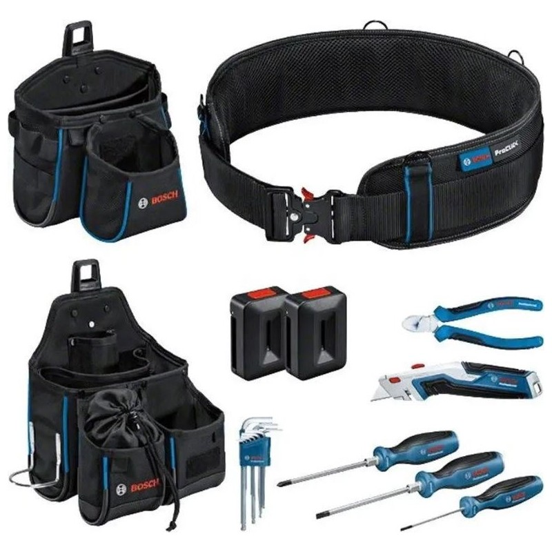 - Artikelname: Bosch Professional: ProClick 108-Werkzeuggürtel, Werkzeugtaschen GWT 2 und GWT 4, 3 Schraubendreher, 9-teiliger Sechskantschlüsselsatz, Kombizange und einklappbares Universalmesser