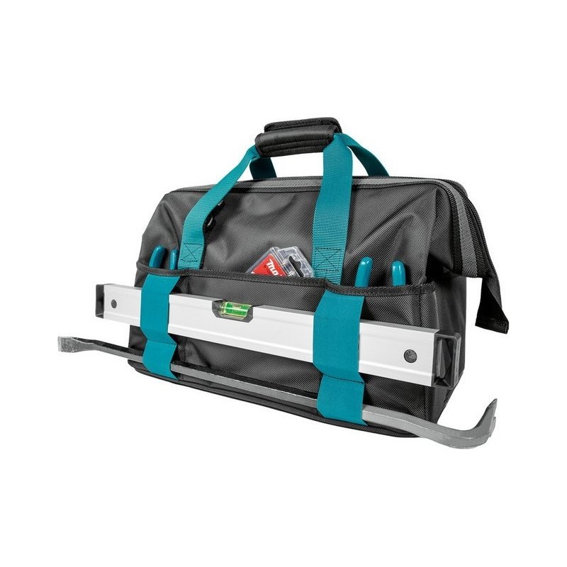Werkzeugtasche mit Reißverschluss und einer verstärkten, großen Öffnung, die einen guten Überblick über den Inhalt gewährleistet. Die Tasche verfügt über zahlreiche Innen- und Außenfächer sowie elastische Bänder zur sicheren Aufbewahrung von Zubehör und Handwerkzeugen.