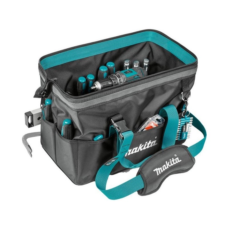 Praktische Werkzeugtasche mit einer besonders großen, verstärkten Öffnung und einem Fassungsvermögen von ca. 26 Litern.