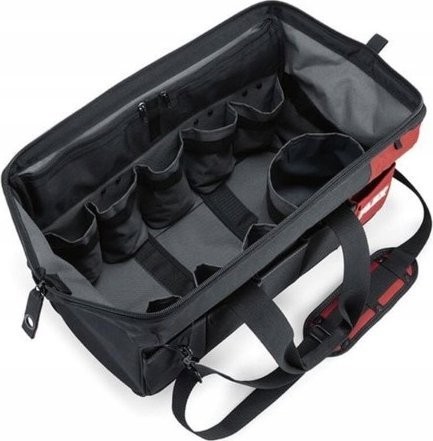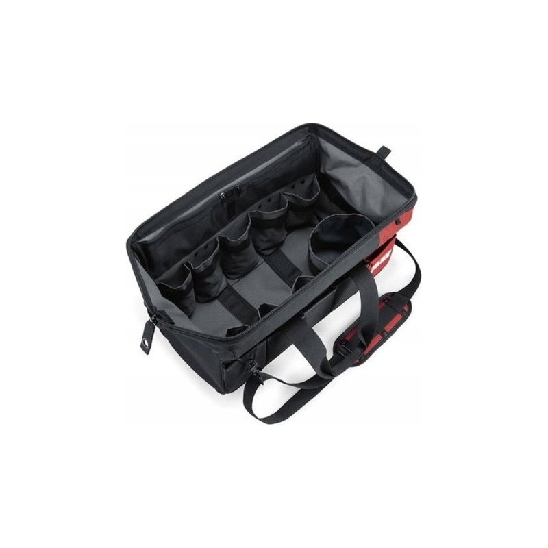 Praktische Transporttasche aus kunststoffverstärktem, reißfestem Textilmaterial mit sehr großer Öffnung. Mit großem Stauraum im Inneren für bis zu drei Maschinen sowie Fächern für Zubehör wie Akkus, Ladegeräte usw. und fünf Außentaschen an der Vorderseite. Ausgestattet mit Gummifüßen, verschließbarem Reißverschluss, gepolstertem Tragegurt und stahlverstärkten Griffen.