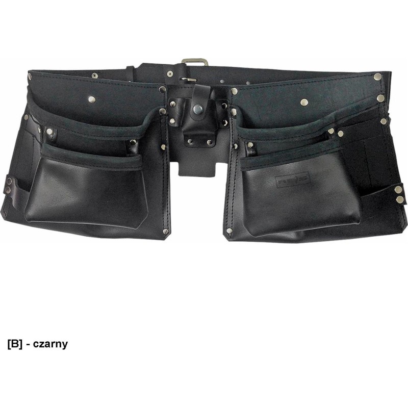 Kunstleder. Zehn Werkzeugtaschen: zwei große, zwei mittlere und sechs kleine; in der Mitte befindet sich eine Halterung für ein Maßband.
